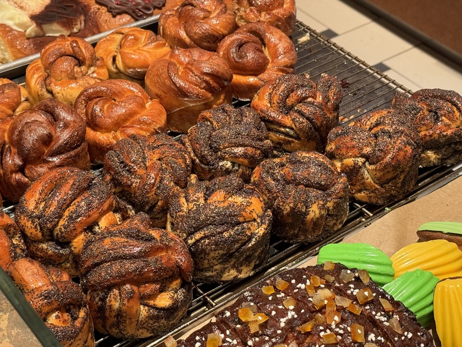 Перед сладкой витриной тяжело не растеряться, выбирая между шведской булкой с маком (350₽) или карамельной бриошью с кремом (450₽). Её при вас отделяют от общего противня булочек и кладут на тарелку — зрелище выходит гипнотизирующее. Кроме этого, есть пряные и шоколадные кексы, милейшие мадленки (220₽) и популярные маритоццо (440₽) — итальянские булочки со взбитыми сливками.