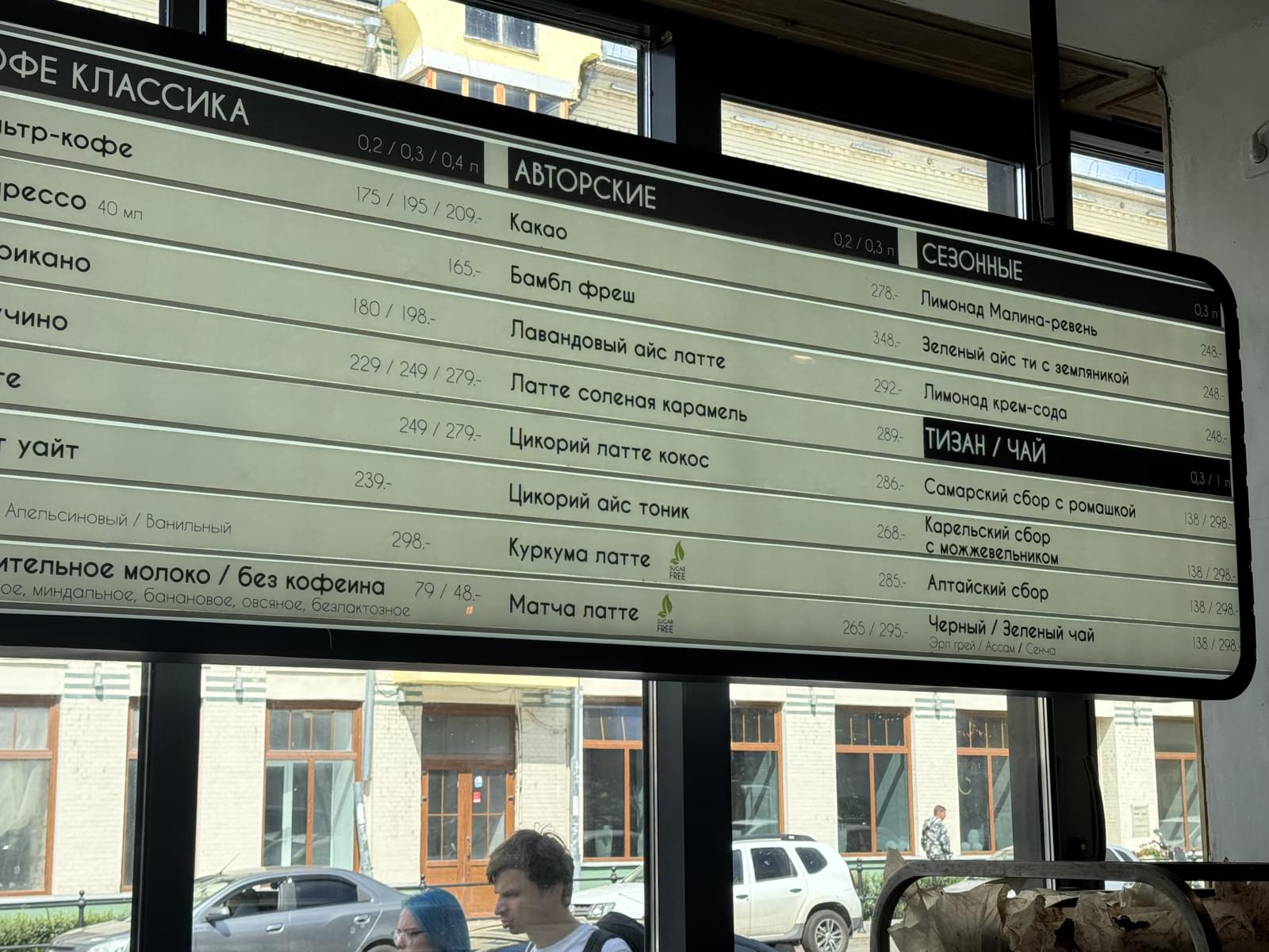 Кофе и напитки: от фильтра до цикорий-тоника. Кофейная часть не уступает пекарской: Фильтр-кофе — от 175₽, Ванильный раф — 298₽, есть матча-латте и куркума-латте. Особенная позиция — цикорий-тоник (278₽): редкий для кофеен напиток, который приятно освежает и поддерживает «ретро-настроение» бренда.