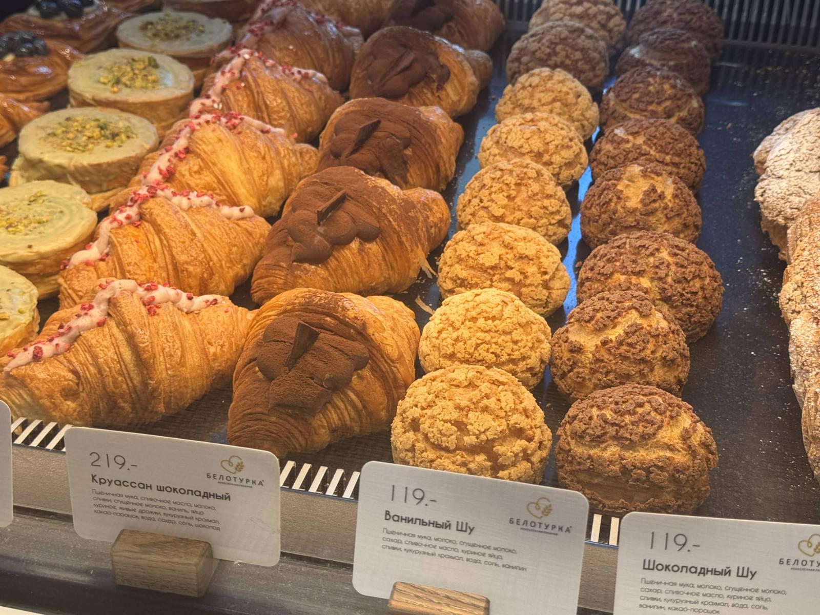 Выпечка — сильная сторона «Белотурки»: витрины занимают две большие страницы меню. Популярные позиции: запеченый круассан с ветчиной — 308₽, трубочки — 149₽, Шу — 119₽, яблочные ватрушки — 109₽.