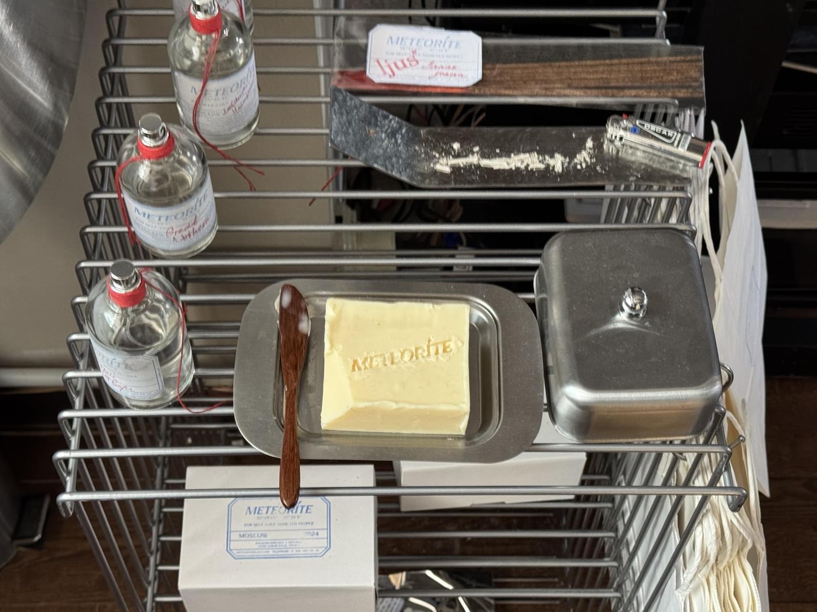 Так, мы нашли интересное мыло в виде масла, к которому добавляется масленка и деревянный нож.