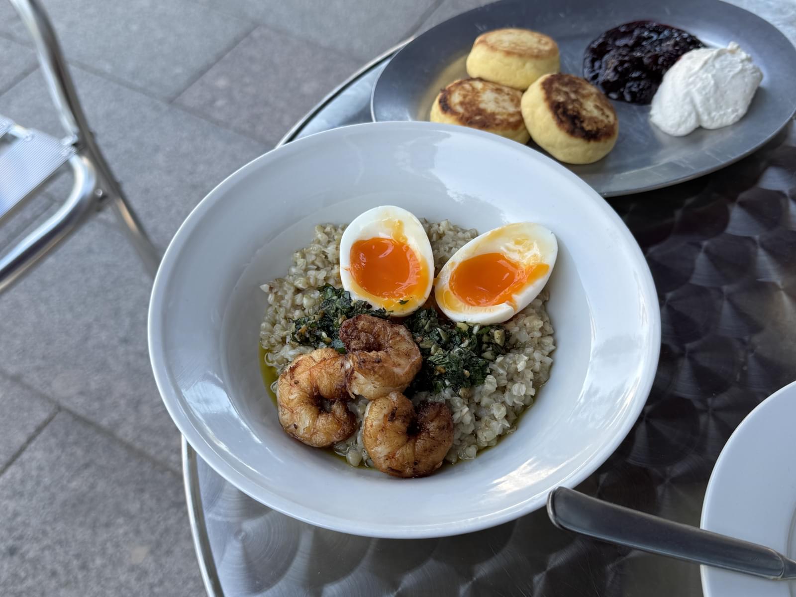 В выборе блюд полностью доверились официанту. В качестве старта — зелёная гречка с гремолатой и яйцом (460₽), которую мы дополнили тремя креветками (+480₽).