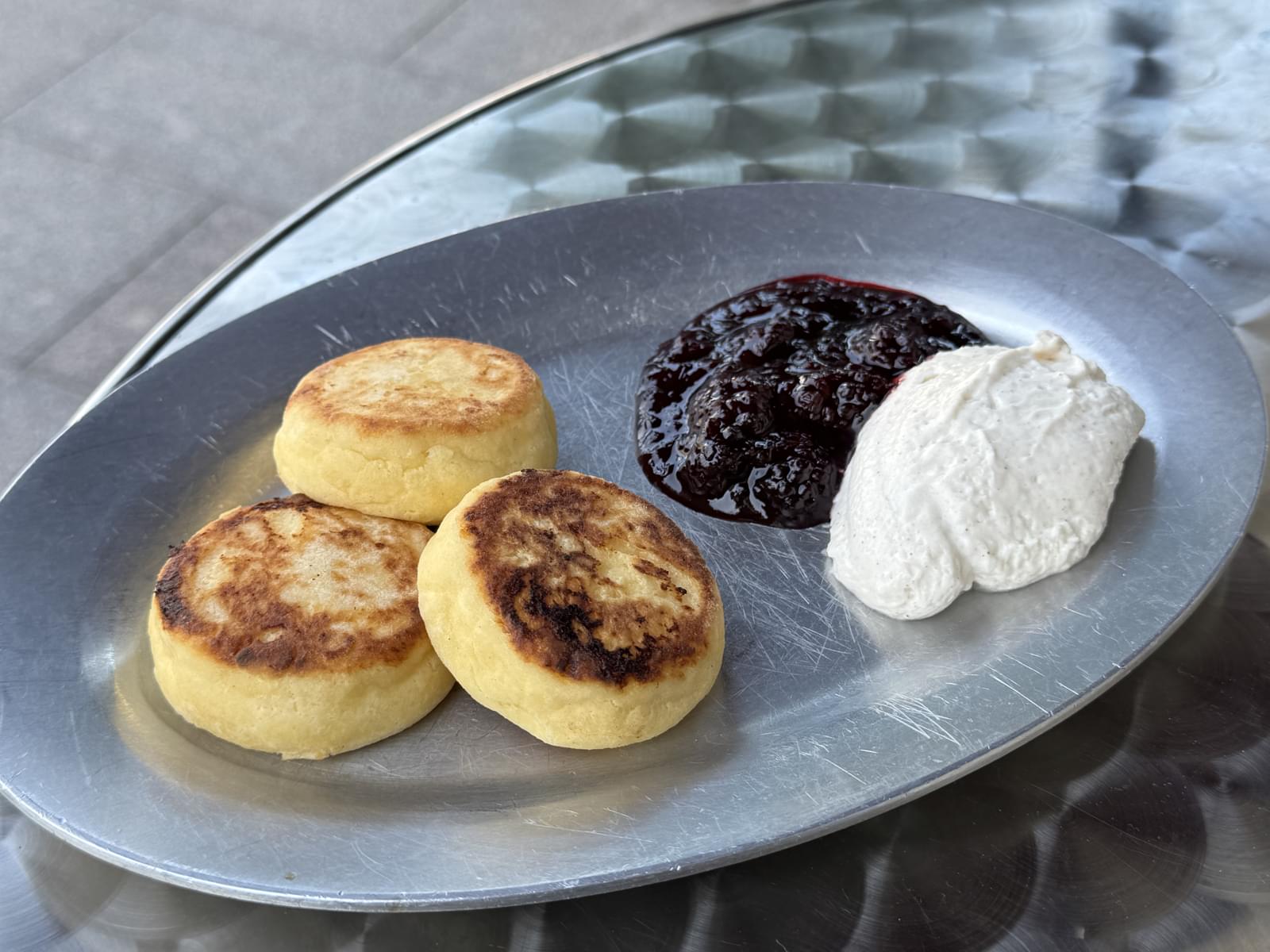 На десерт — сырники с ежевикой и крем-сыром, в который, кстати, добавили корицу! План на четверг — вместо капучино посыпать сырники корицей. Работает или нет — проверим 5 числа следующего месяца. Стоимость — 460 ₽ за порцию.