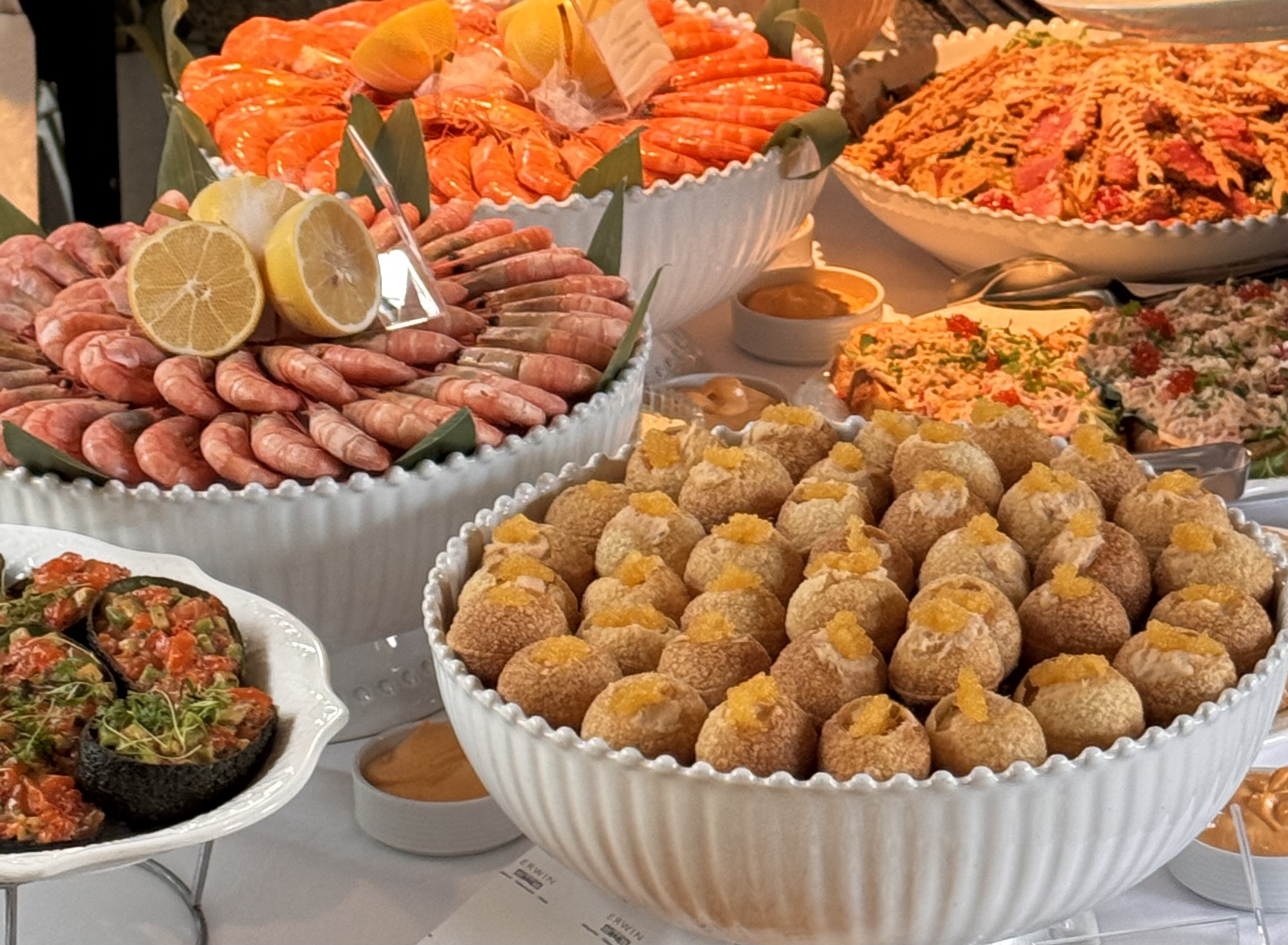 Бранч в «Павильоне» начинается с большого фуршетного стола, на котором расположились и холодные закуски, и морепродукты, и горячие блюда, и гарниры, и десерты: магаданская и северная сладкая креветка, краб опилио, устрицы. Дополняют подачу сыры, оливки, артишоки, чука с эдамаме, паштет из щуки, вафли с уткой и луком конфи, брускетта с треской, бриошь с крабом и икрой тобико, блины с лососем и красной икрой, круассан с мортаделлой, крем-чизом и трюфелем, рыбный рийет, мини-буратта, вителло тоннато, моцарелла с томатами и песто, обожжённое сашими из лосося, севиче из сибаса и киноа с креветками.