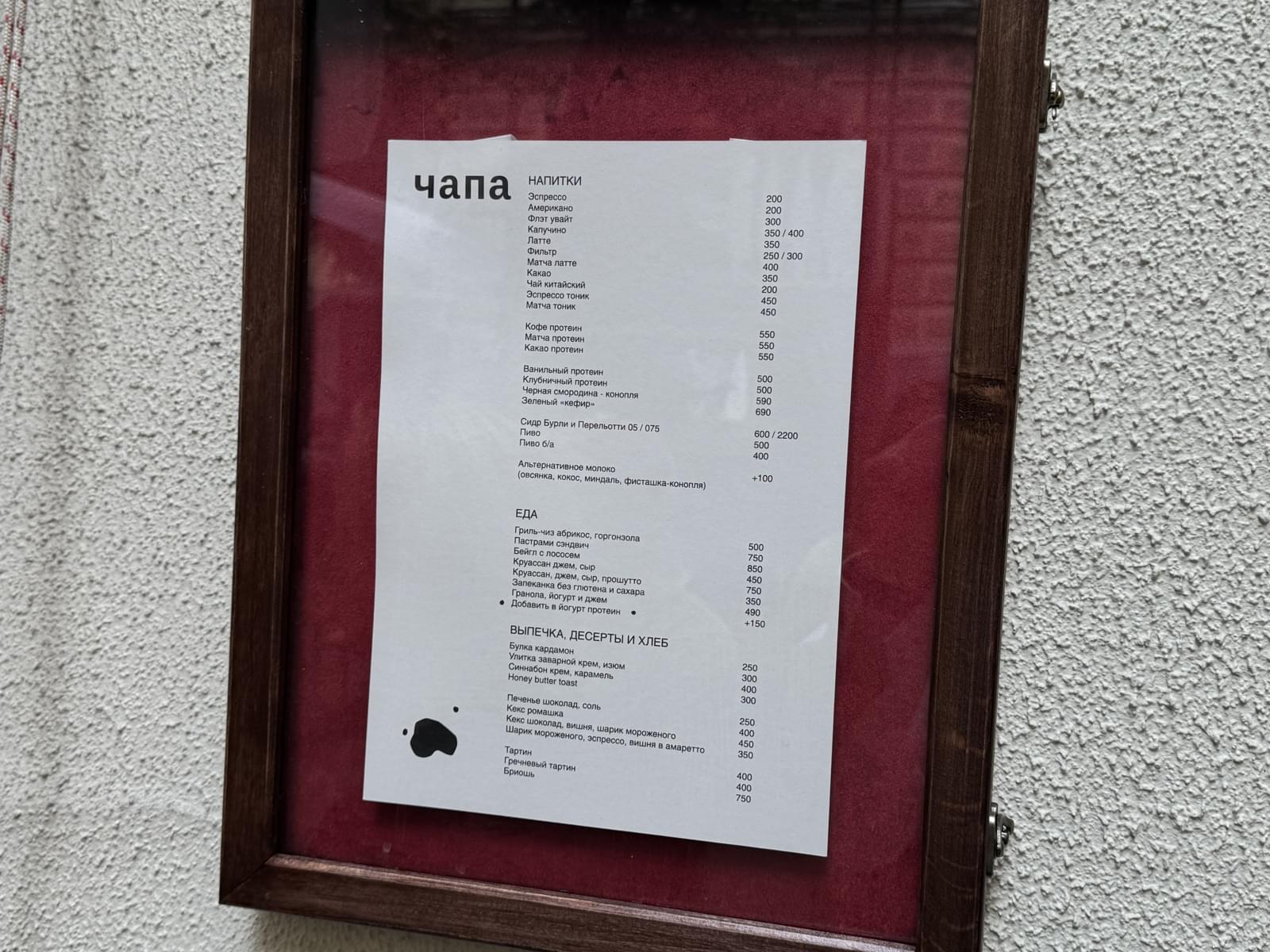 Меню «Чапы» собирает всё, за что любят современные кофейни с выпечкой. По кофе — эспрессо от 100 до 200 рублей, латте 350 рублей, эспрессо-тоник 450 рублей. Отдельный акцент сделан на протеиновых напитках: кофе-протеин, матча-протеин и какао-протеин по 550 рублей. В разделе авторских напитков выделяется зелёный кефир за 690 рублей: мята, кокосовая вода, шпинат, авокадо и сок лайма; ещё одна заметная позиция — «чёрная смородина–конопля» на конопляном молоке за 590 рублей. Есть и базовый бар: сидр 600 рублей, пиво 500 рублей.