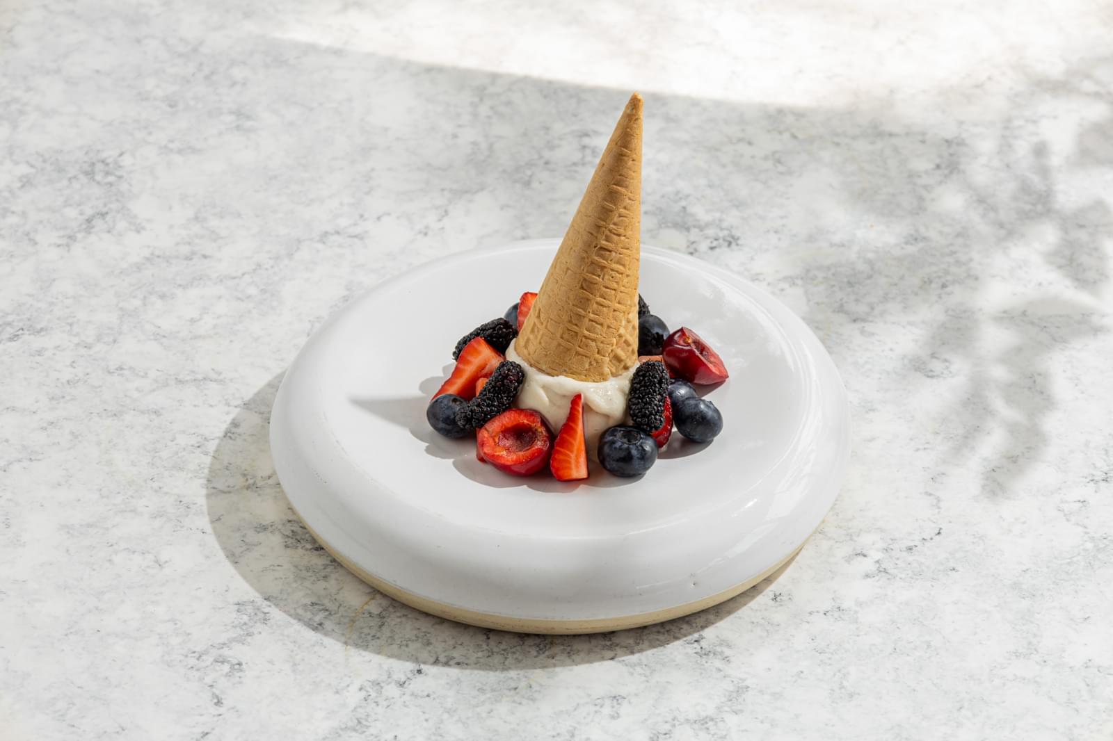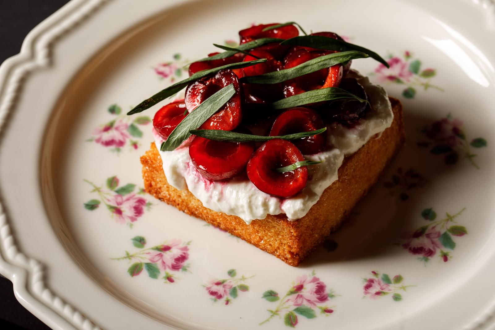 В одном из самых красивых и роскошных ресторанов Москвы создали летний и очень фотогеничный десерт - тарт из нежного медового бисквита, пропитанного соком алоэ, с кремом маскарпоне, яркой земляникой и сорбетом из тархуна и персика.