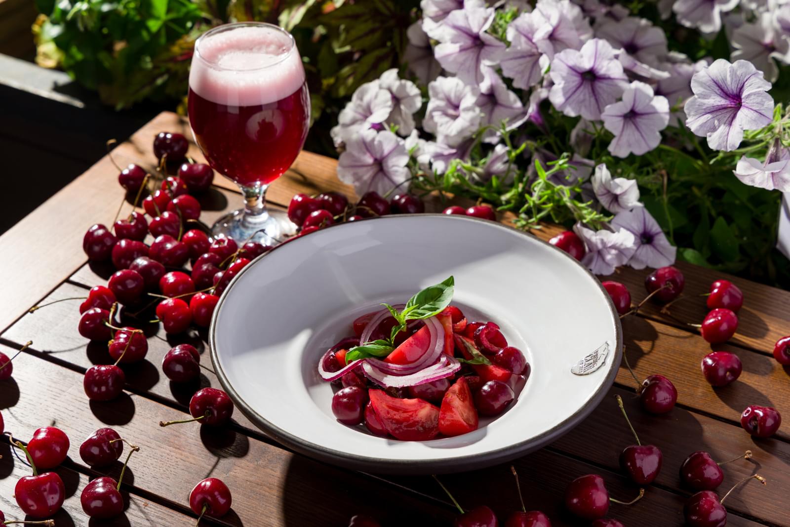 Конечно, «Ян Примус» - это в первую очередь ресторан пивной, но сочная черешня ему тоже не чужда! Здесь предлагают насладиться черешней вкупе со спелыми помидорами в гранатовом соусе. А венчает все это великолепие вкуса капелька оливкового масла, базилик и крымский лук!