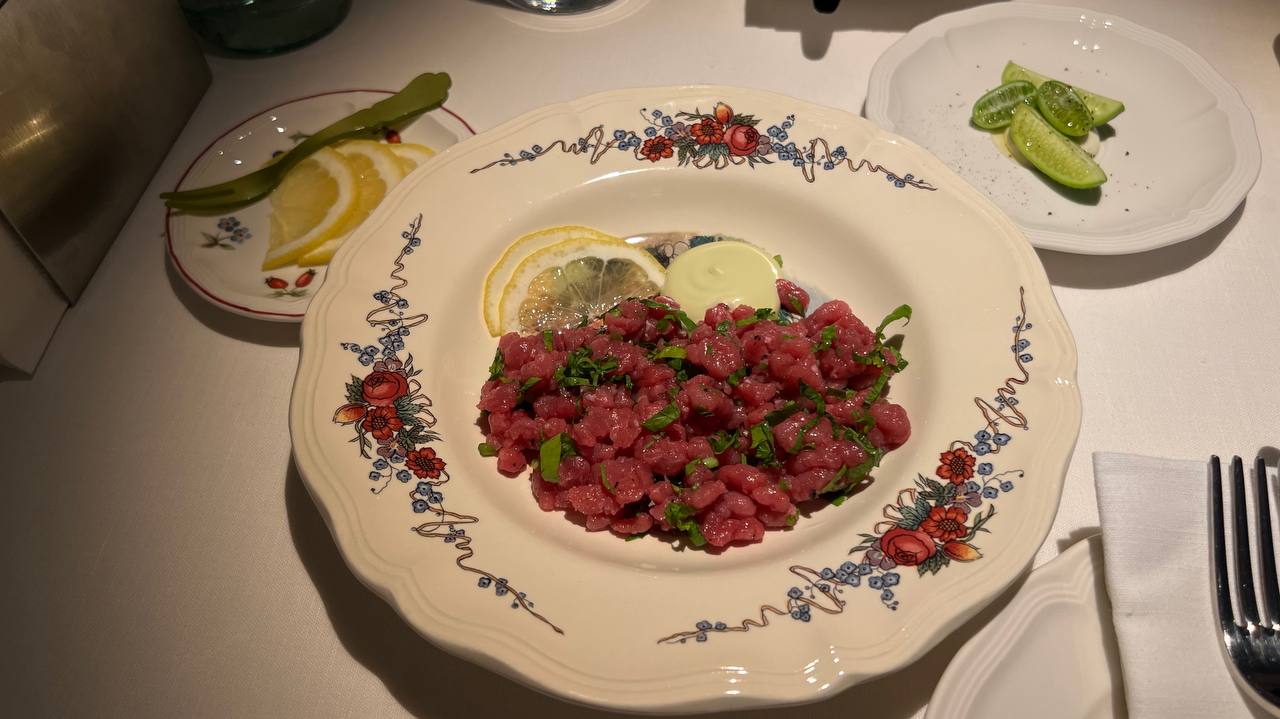 Тартар из молодого ягнёнка — заправка минимальная, акцент на чистом вкусе мяса. История на любителя: если хотите ярче — попросите усилить заправку (1700₽).