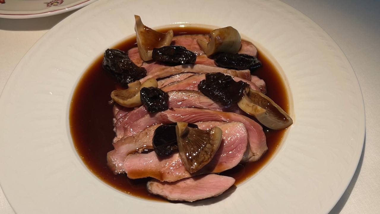 Утиная грудка medium-well с белыми груздями и черносливом (2100₽). Вот где пампушки особенно кстати.