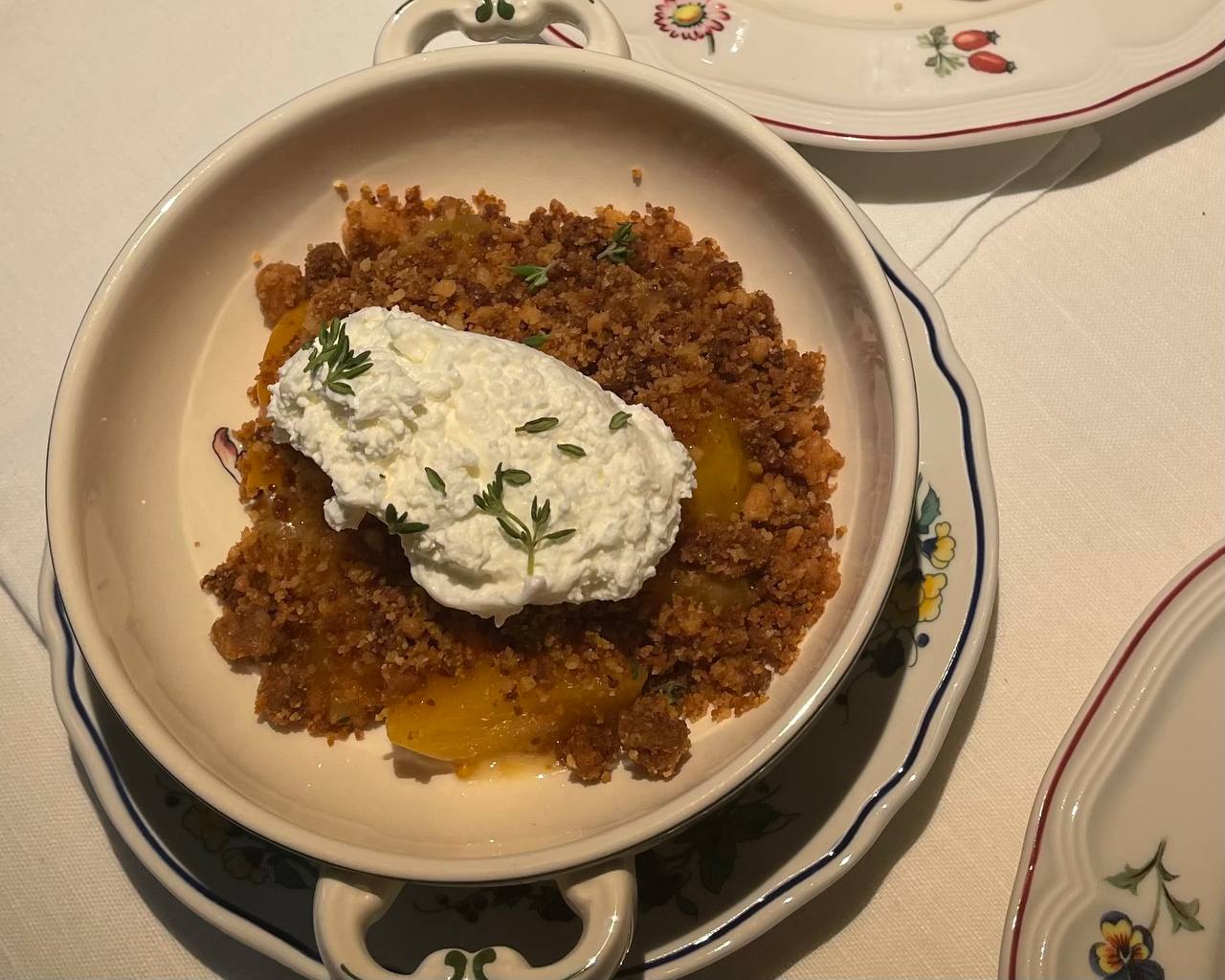Карамелизированные нектарины с печеньем — «простая радость» конца ужина, когда хочется тепла и фруктов (700₽).