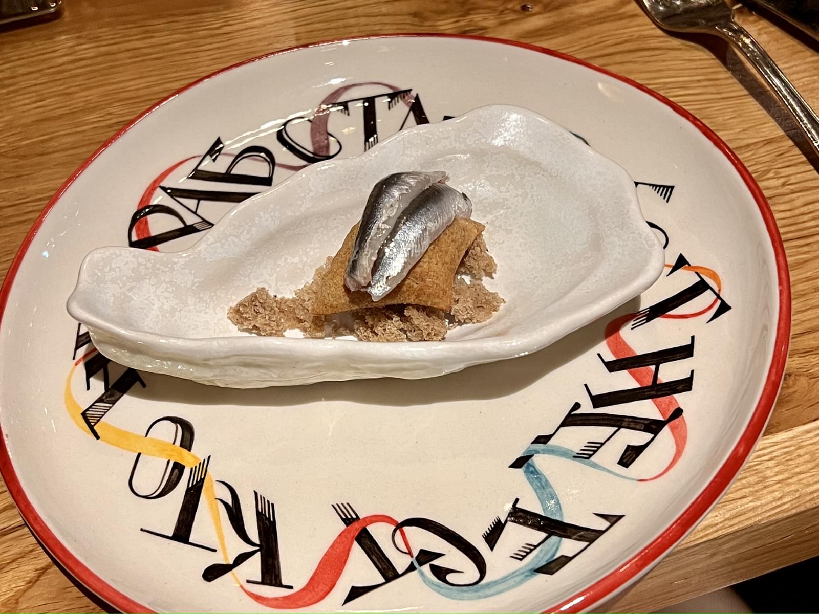 Открывают сет небольшой закуской «бубновый валет», где черноморская хамса переплетается с томатным соусом.