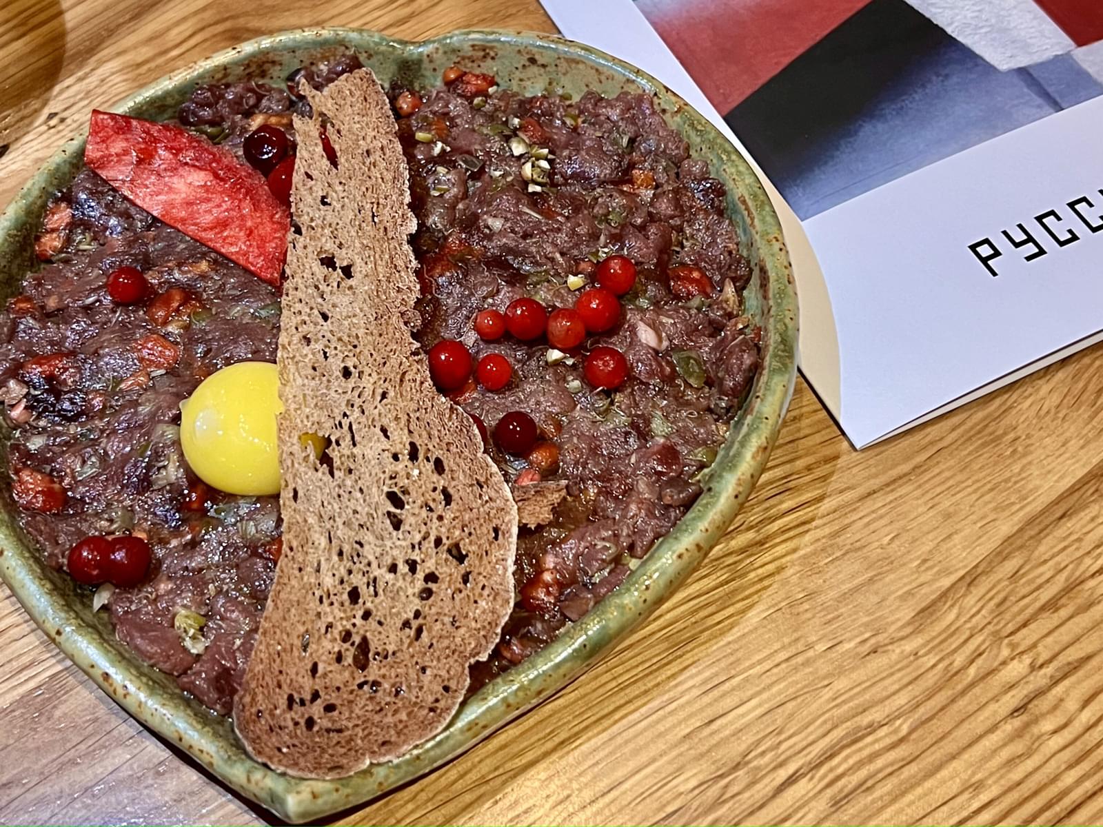 Самым любимым блюдом шефа (по скромному мнению редакции) можно назвать «дыр бул щыл» по мотивам стихотворения Крученых. Заумный язык произведения полностью отражается и в гастрономическом представлении: тартар из вяленого на манер воблы арбуза и оленя выполнен в самых авангардных оттенках.
