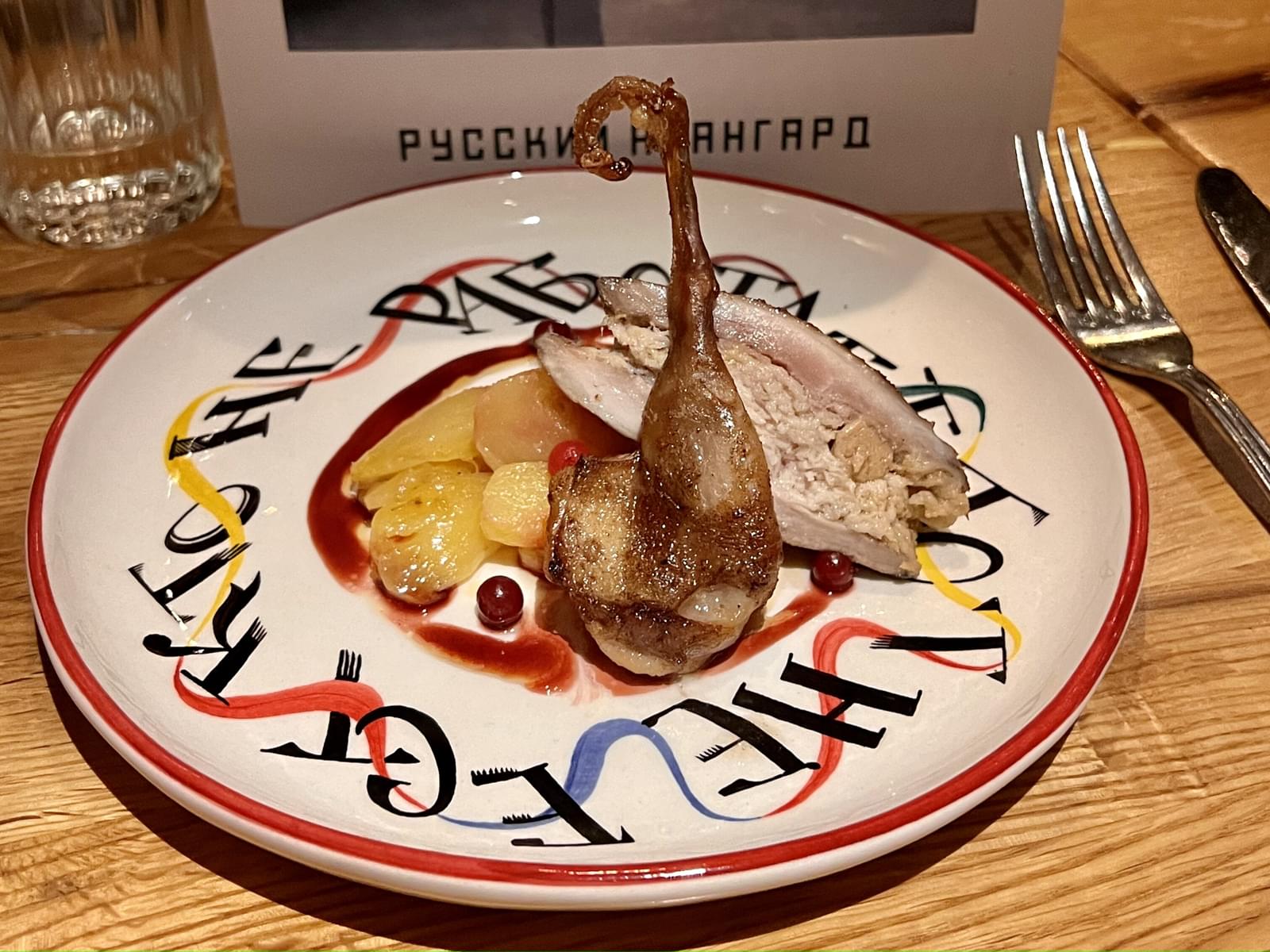 Перенесение некоторых техник на непривычные для гостей продукты присутствуют и в других подачах: например, ананасы квасят и подают к столу с изящной ножкой рябчиков - умиляющее зрелище к знакомой каждому советскому человеку фразе «Кто не работает, тот не ест!».