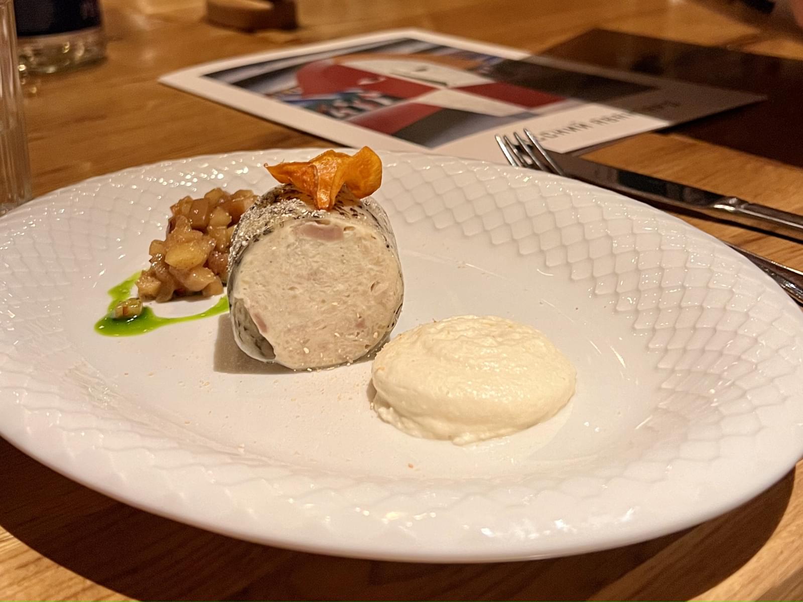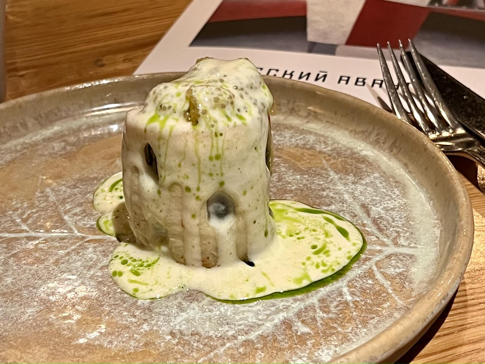 Ещё одна рыбная история поджидает нас буквально через одну подачу в виде угольной рыбы с икорным соусом. Это ни что иное, как интерпретация памятника архитектуры советского авангарда — «Дома Мельникова». В подаче повторили оригинальный художественный образ самого дома, спрятав в цилиндр из теста нежнейшую угольную рыбу.