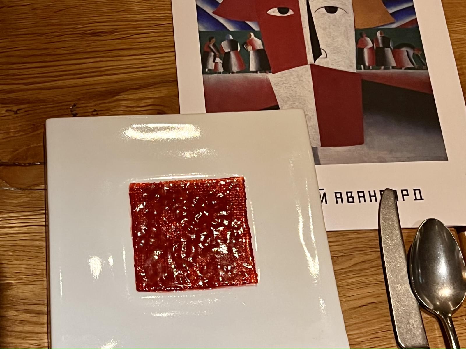 Следующую подачу знаменуют самым известным произведением Малевича «Червоный квадрат», предлагая ощутить, как манная каша может уживаться на одной тарелке с осетровой икрой. Безумное откровение черно-белого и новый, авангардный вкус.