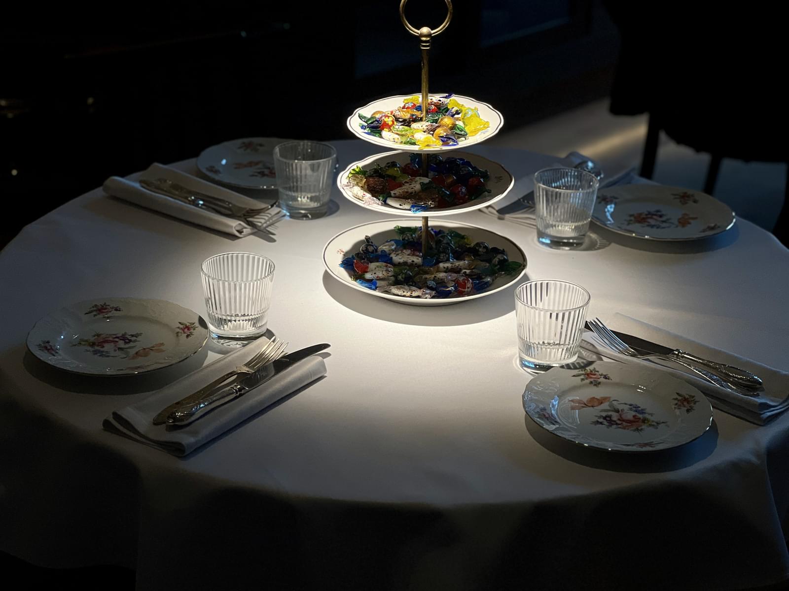 Ребекка — и, правда, становится настоящей шкатулкой с визуальными сокровищами: стеклянные конфетки, которые не отличить от настоящих, прячутся в цветных вазах на столах гостей; уменьшенная, уменьшенная копия той самой Ребекки — что смотрит с картины — среди растущих цветов из супниц; а дальний угол ресторана со строгим видом охраняет винный шкаф в темном, изысканно дорогом, «костюме». Маленькие посудные арт-объекты, вроде кокотниц, сахарниц и чашек в расписных юбках резво перемещаются со стола по комодам, будто и впрямь имеет миссию выдёргивать внимание гостей, не оставляя время на скуку.