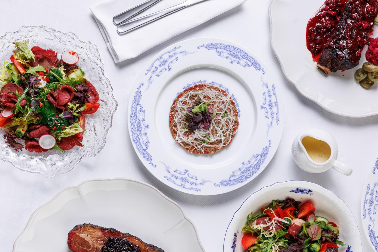 В меню елые грузди со сметаной, подкопчённой на ольховой щепе. Далее в меню салат с копчёной уткой и хрустящими листьями под соусом из трюфеля и выдержанного сыра. Для любителей дичи тартар из оленя с копчёным дайконом и салат с ростбифом из копчёного оленя.