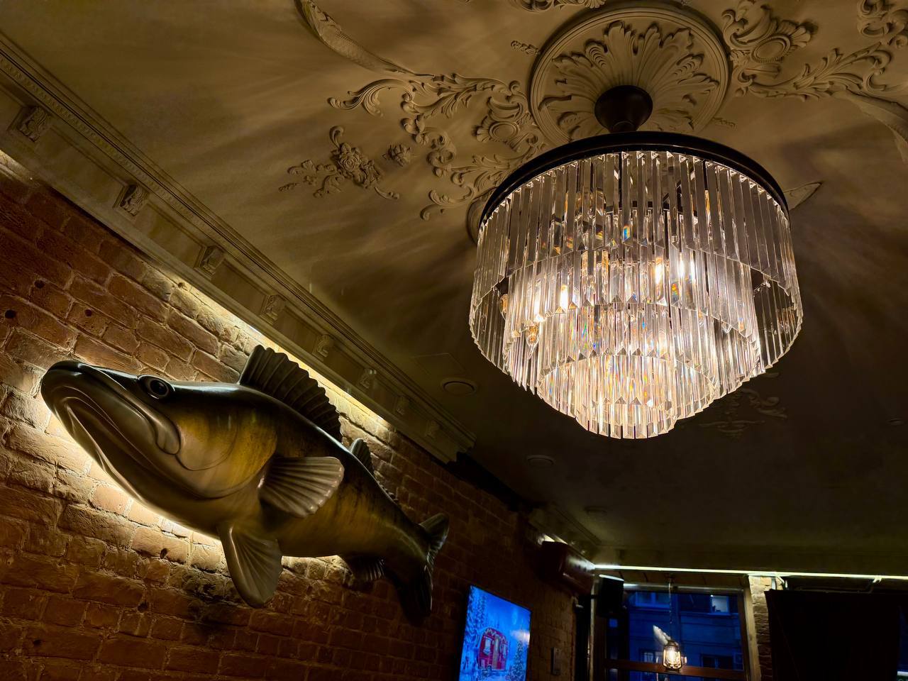Алкогольная пара — импортное пиво в фирменных бокалах и домашние настойки. Интерьер — восторг: чешуя на баре, рыбы на потолке, уборные — интересные инсталляции по половому признаку. Интеллигентный кринж и кайф.