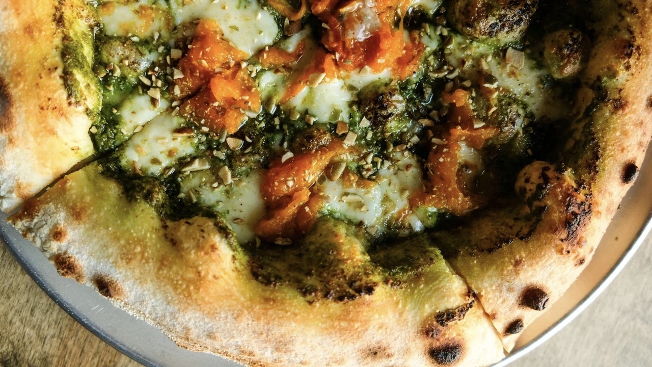 А что если пицца? А что если с тыквой? В ØLIV PIZZA на неделю с 28 октября по 3 ноября ввели спешл: пиццу с тыквой (500₽). Состав ужаса не наводит: сыр моцарелла и горгонзола, соус песто и запеченная тыква, как украшение – тыквенные семечки.