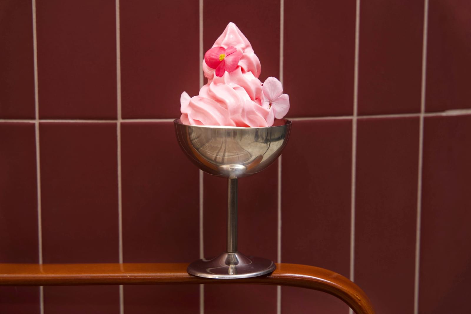 Клубничное с меренгой (650₽) – в основе тягучая французская меренга, покрытая нежно-розовым клубничным мороженым и украшенная съедобными цветами.