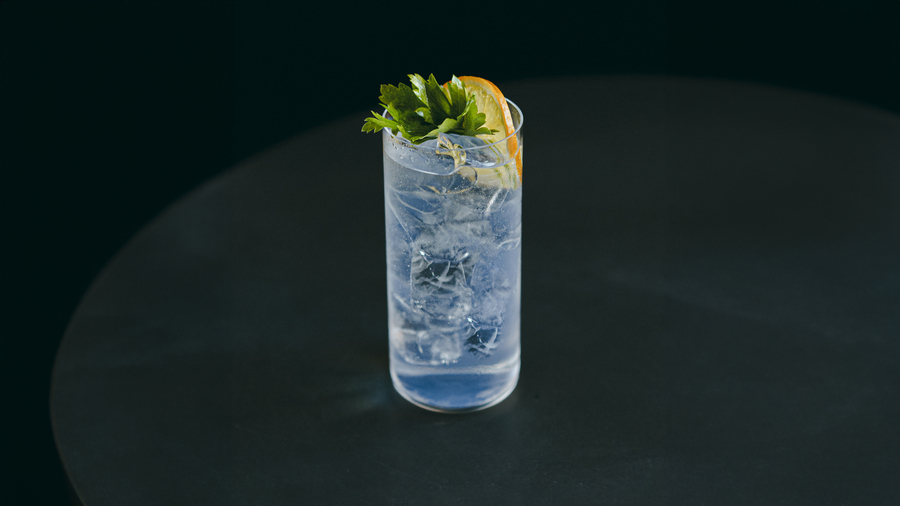 Наполнить бокал на две трети льдом, добавить джин и аккуратно долить необходимое количество тоника, после чего аккуратно перемешать напиток и украсить его лимоном и петрушкой.