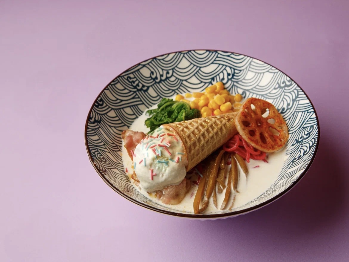 «Пинк Рамен» (650₽) — сливочно-сырный бульон с розовой пшеничной лапшой, жареным лотосом, подкопченным беконом и хрустящим рожком с пломбиром;
