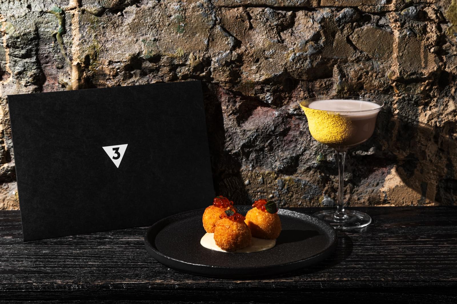 Golden Vow – японский виски, амадзаке, молочный ликёр, желток, домашний красный вермут. Крокеты с белыми грибами, швейцарским сыром, трюфельным соусом и красной икрой.
