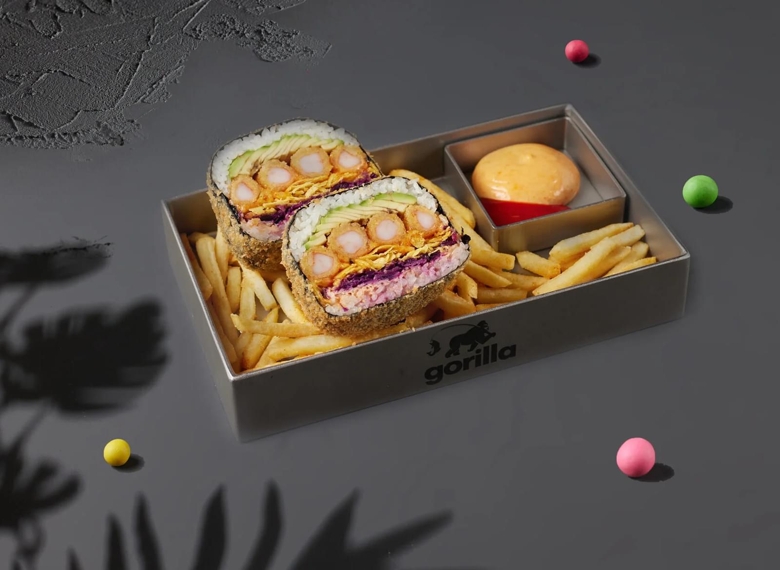Можно как гарнир (100г — 280₽, соусы спайси/сырный), а можно сразу «комбо»: Gorilla-бургер с креветкой (950₽) — креветка, авокадо, снежный краб, капуста куабетсу, начос, соусы шрирача и спайси, нори — и щедрая горсть фри в подарок.