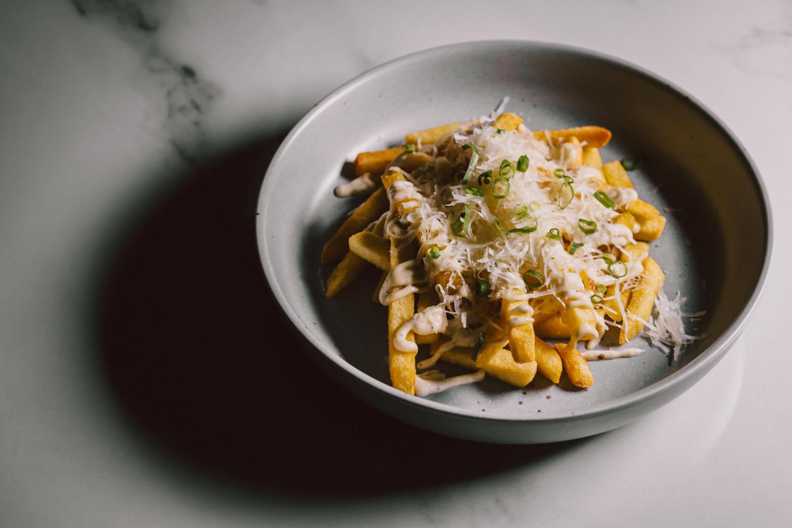 Фри с трюфельным соусом, пармезаном и зелёным луком — 550₽. Такие прям палочки! + сливочный трюфель в соусе + свежая зелень — богато, но без лишнего шума. К картофелю редакция рекомендует взять коктейль «Негрони».