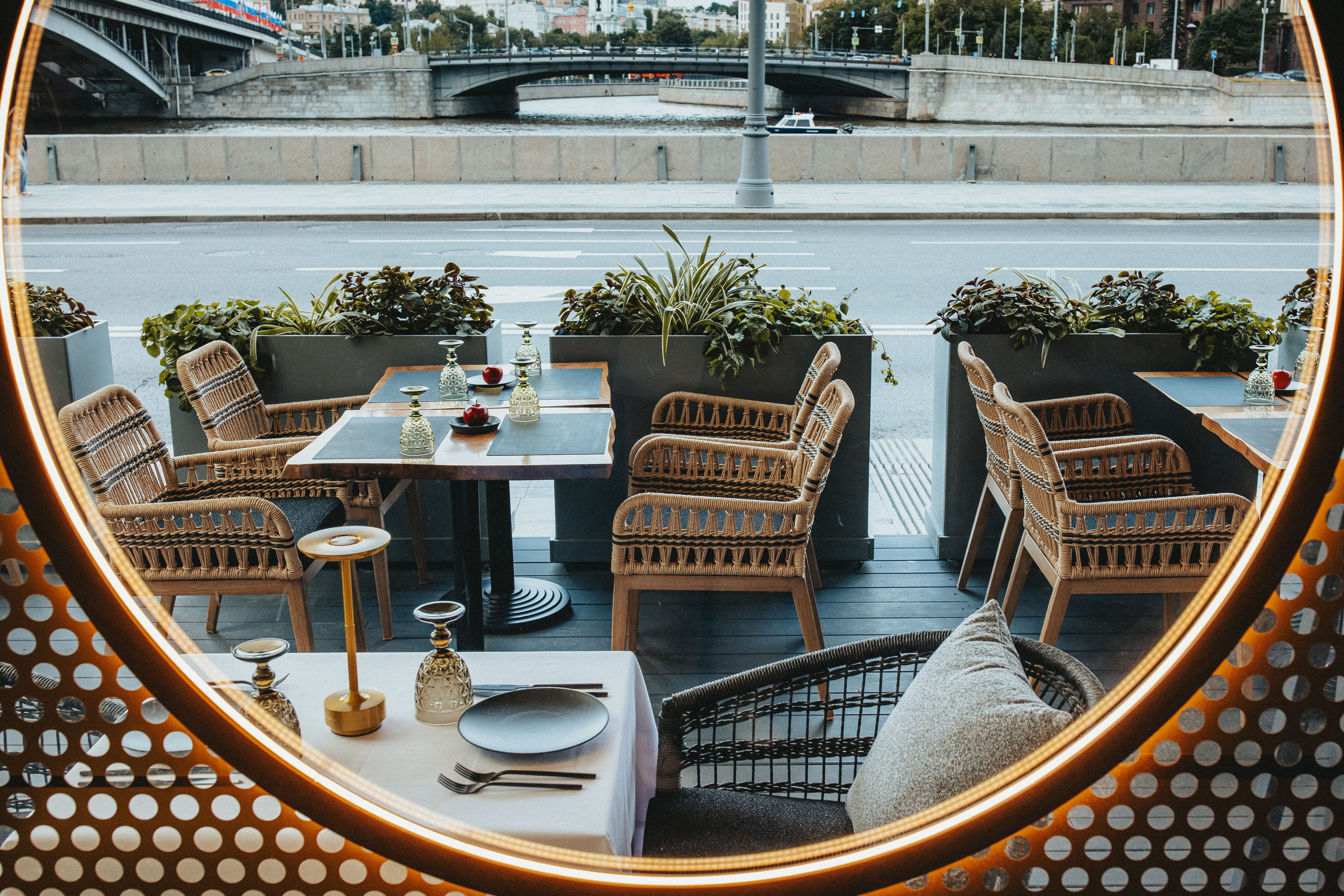 Обновлённая терраса с панорамным видом на набережную со столами в двух стилях: Mykonos ближе к воде и Saint-Tropez со скатертями y окон.
