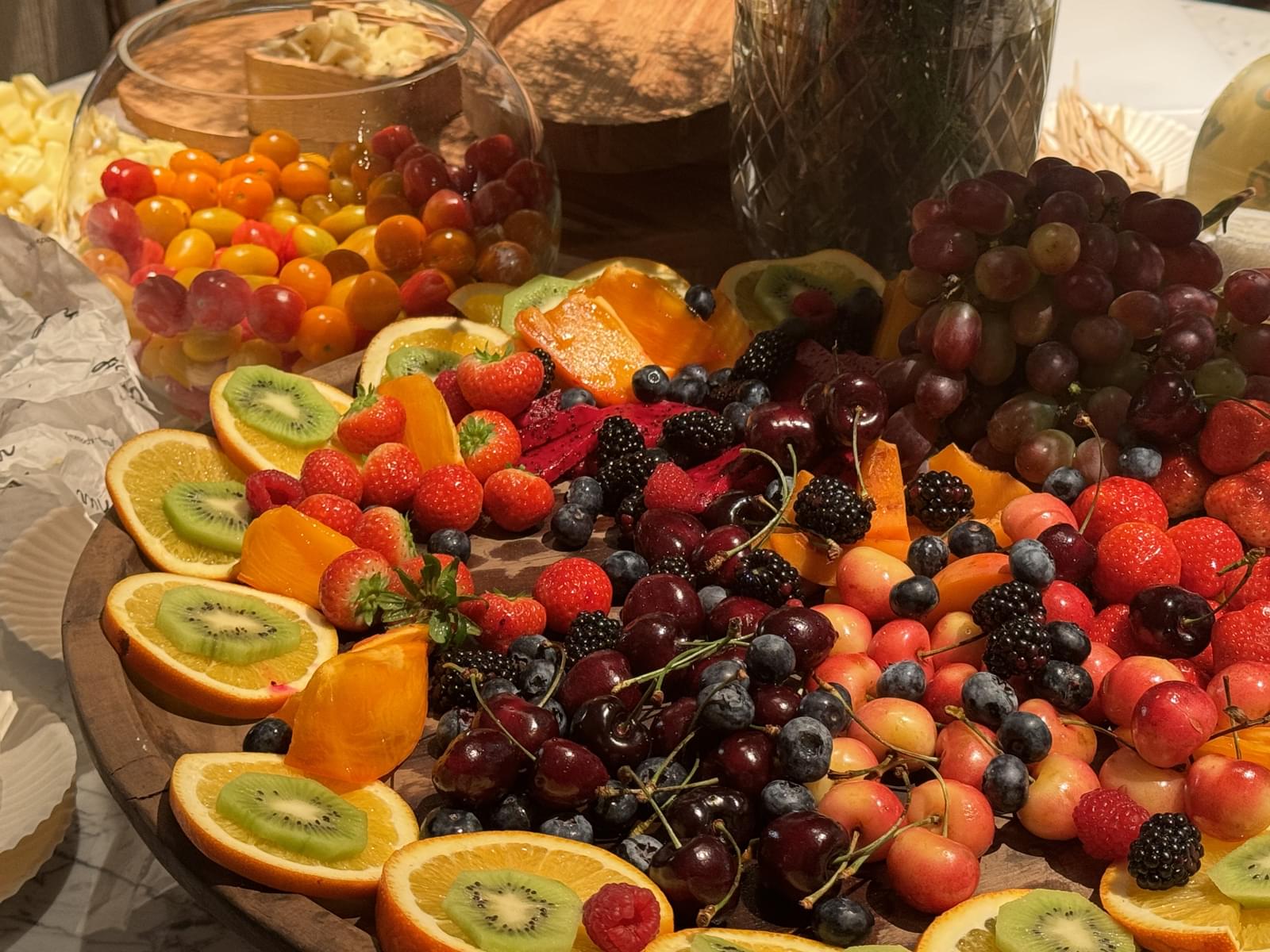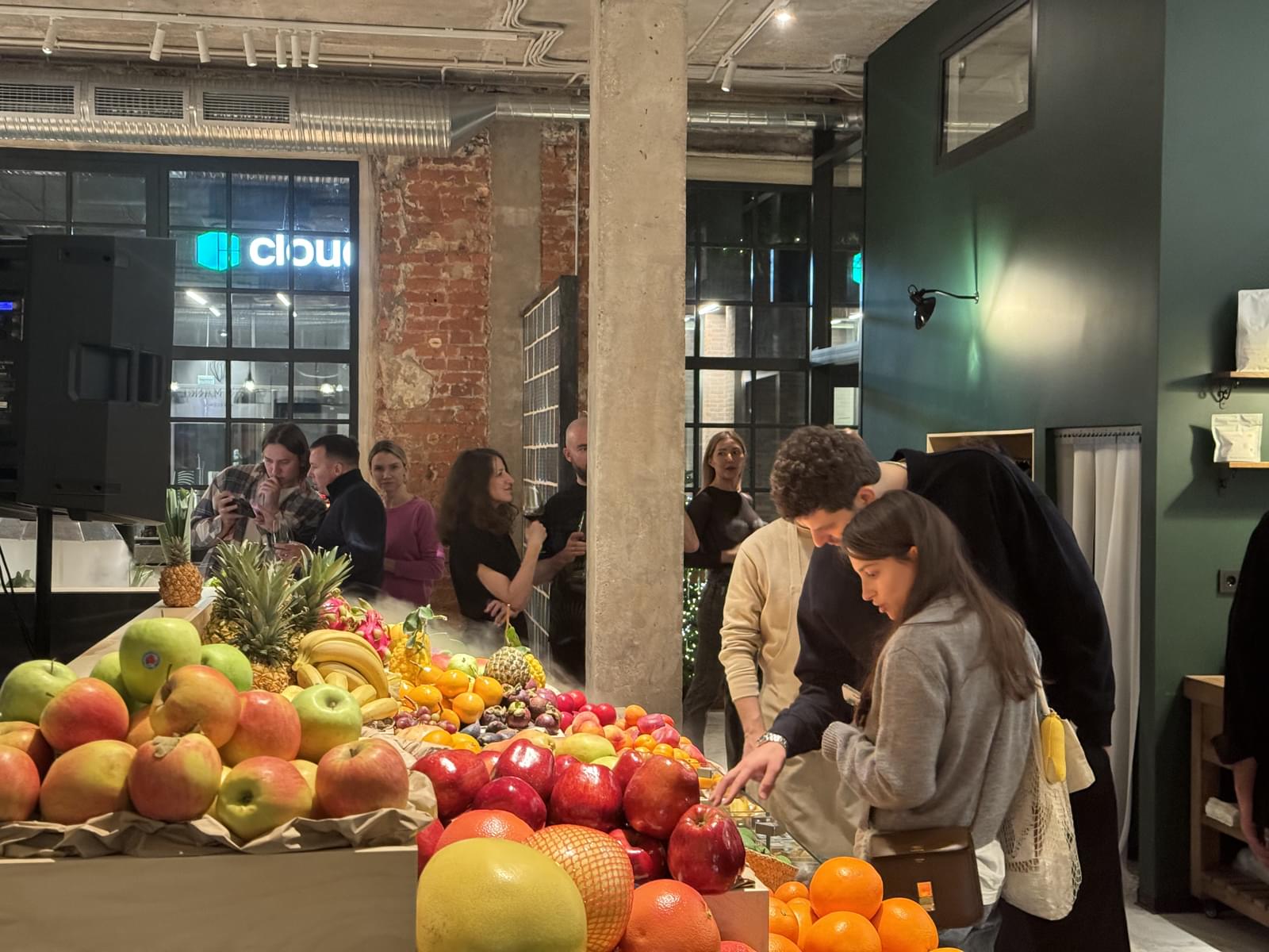 • Фрукты и овощи: в центре пространства расположен корнер с ярким представлением — фонтанчик который встречает гостей стал настоящим центром притяжения всего вечера. Каждый гость успел сделать с ним фотографию и заснять его в свои социальные сети.