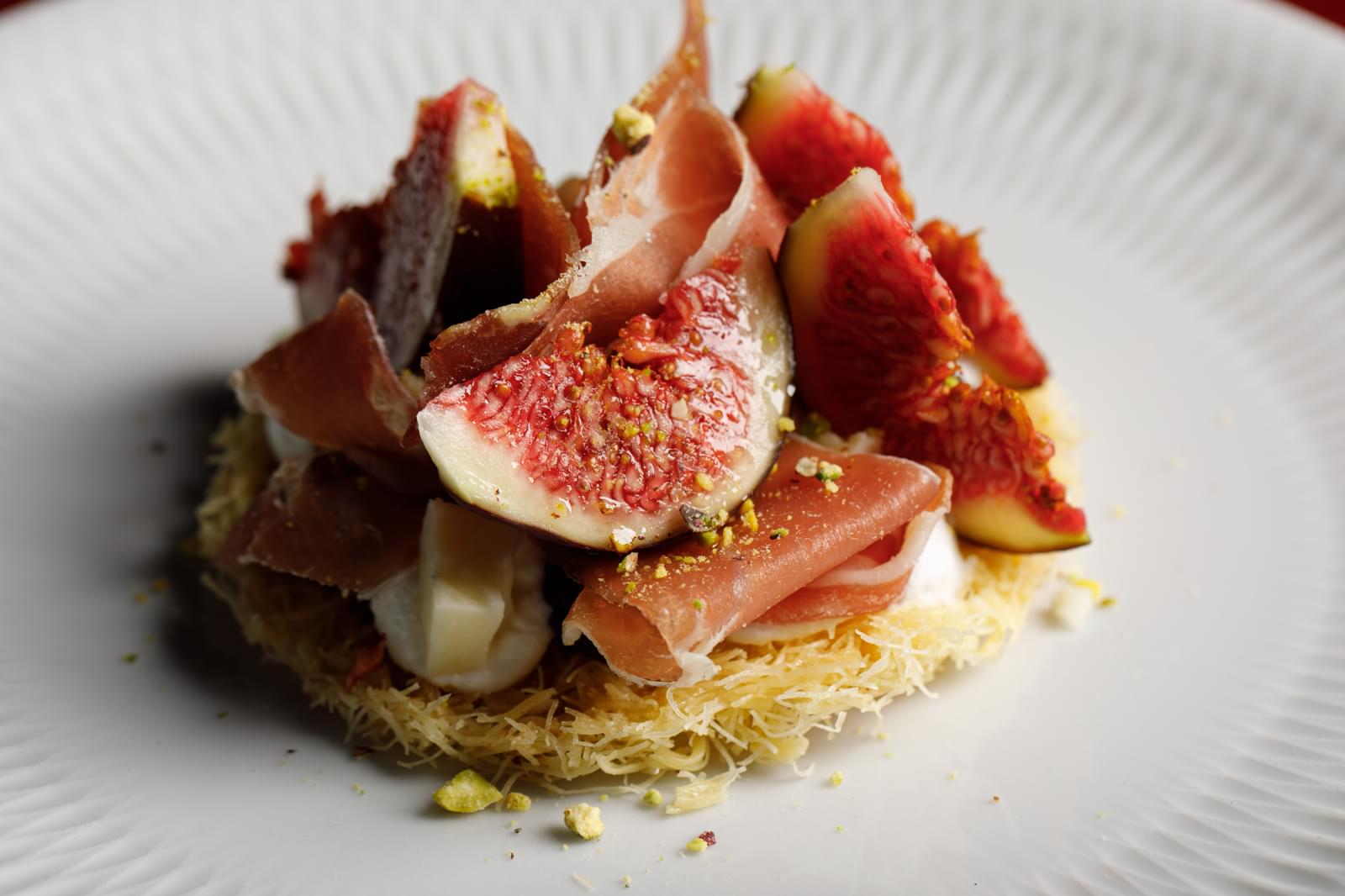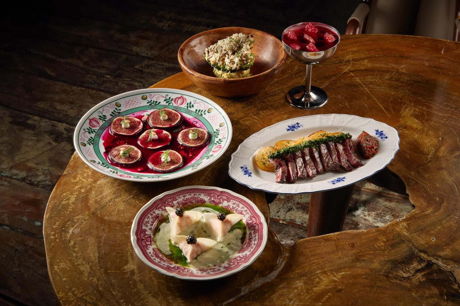 Дегустационный сет: инжир с кремом и голубым сыром, копчёный тунец с арбузом, спагетти с чёрным чесноком, пломбир с хересом. 3 000₽