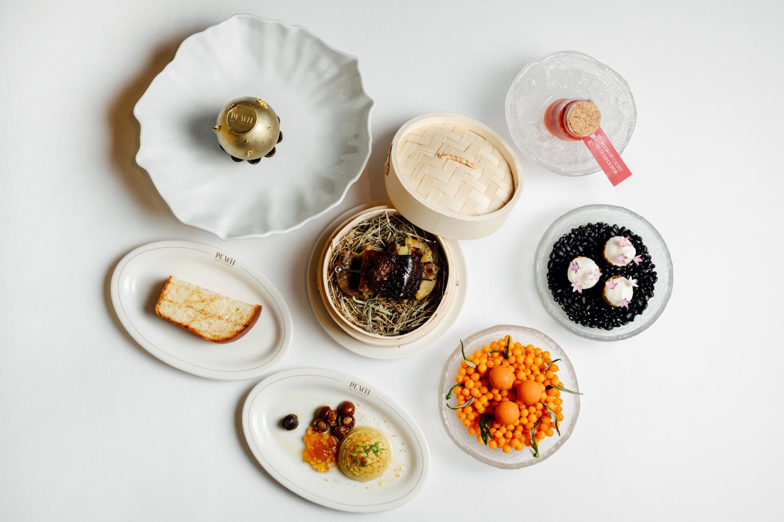 Дегустационный сет: амюз-буш с фуа-гра, паштет из лесных грибов с бурбоном, подкопчённое ребро с картофелем и салатом из томатов, облепиховые бон-боны, десерт Roshе. 6 900₽