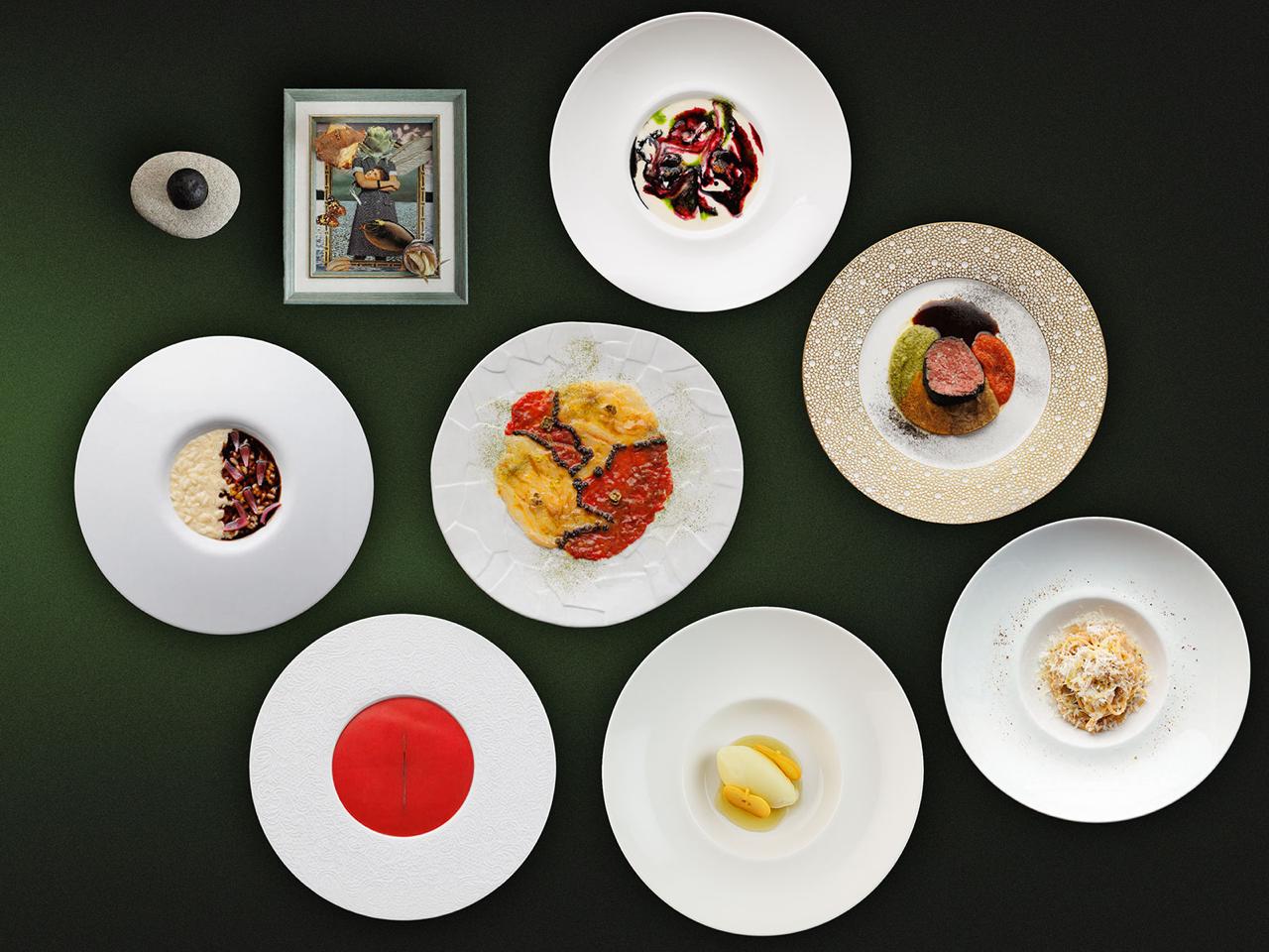 Дегустационный сет: фокачча с боттаргой, сардины с апельсином и фенхелем, мусс из трески, ризотто с гарумом, филе миньон, сорбет из зелёного яблока, Zuppa inglese и другие позиции.
