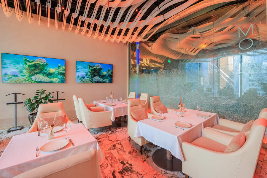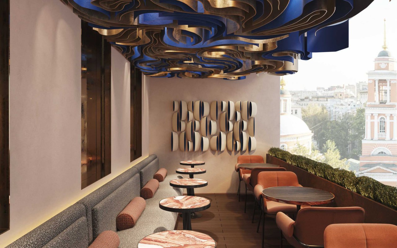 Панорамный вид на Москву и среди предложенных блюд: мозговая косточка с соусом кунжутный самбал, лепешки роти с начинками и шесть видов сашими. Шеф-поваром стал Анатолий Сон, работавший с одним из лучших мастеров кухни Ближнего Востока Рифом Отманом.