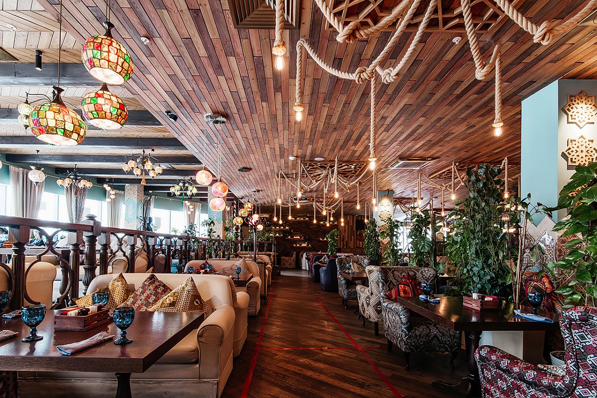 Ресторан с душой и смыслом. Наверху — зал с панорамными окнами и открытой кухней, внизу — караоке и камерный уют. Для детей есть отдельная комната с аниматорами, где весело и безопасно. Место, где родители отдыхают, а дети счастливы — редкий баланс, который здесь соблюдён идеально. А какие арки!