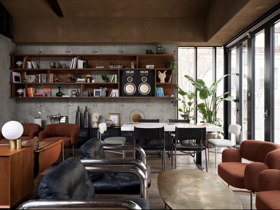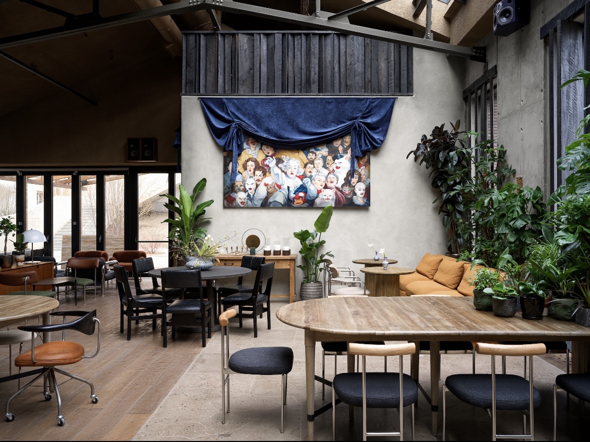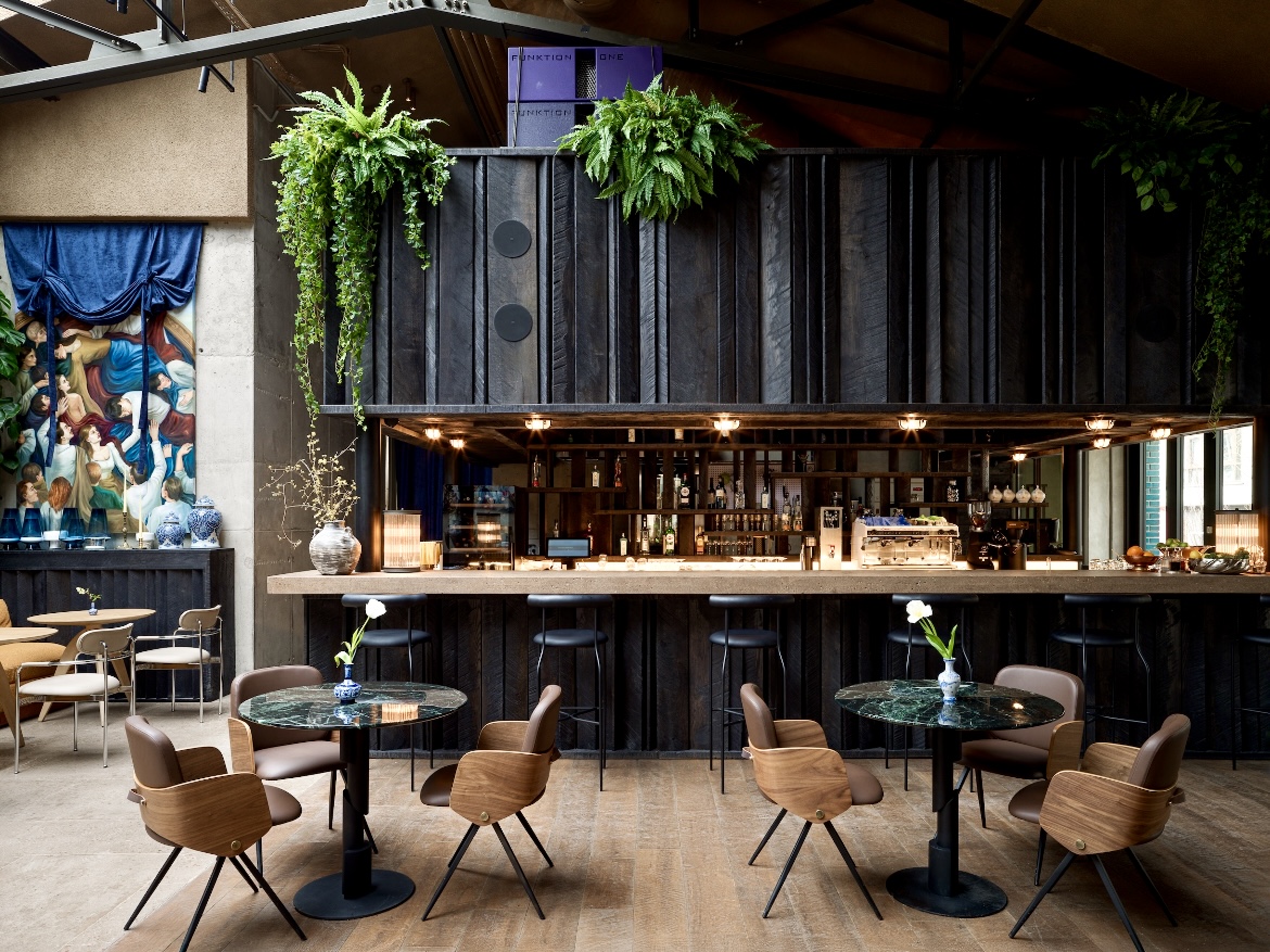 Весной 2024 сделали первые шаги в сторону культурного пространства и чуть меньше, чем за год, отлили стены бетоном, добавили света панорамными окнами и буквально на руинах выстроили узнаваемую концепцию: с винтажными деталями, экстравагантными картинами и шелестом живой зелени в интерьере. В центре поставили два больших коммунальных стола, напротив бара расположили круглые столики на двоих, а в скрытых нишевых пространствах добавили дизайнерских мягких кресел и стильных мелочей на подвесных полках.