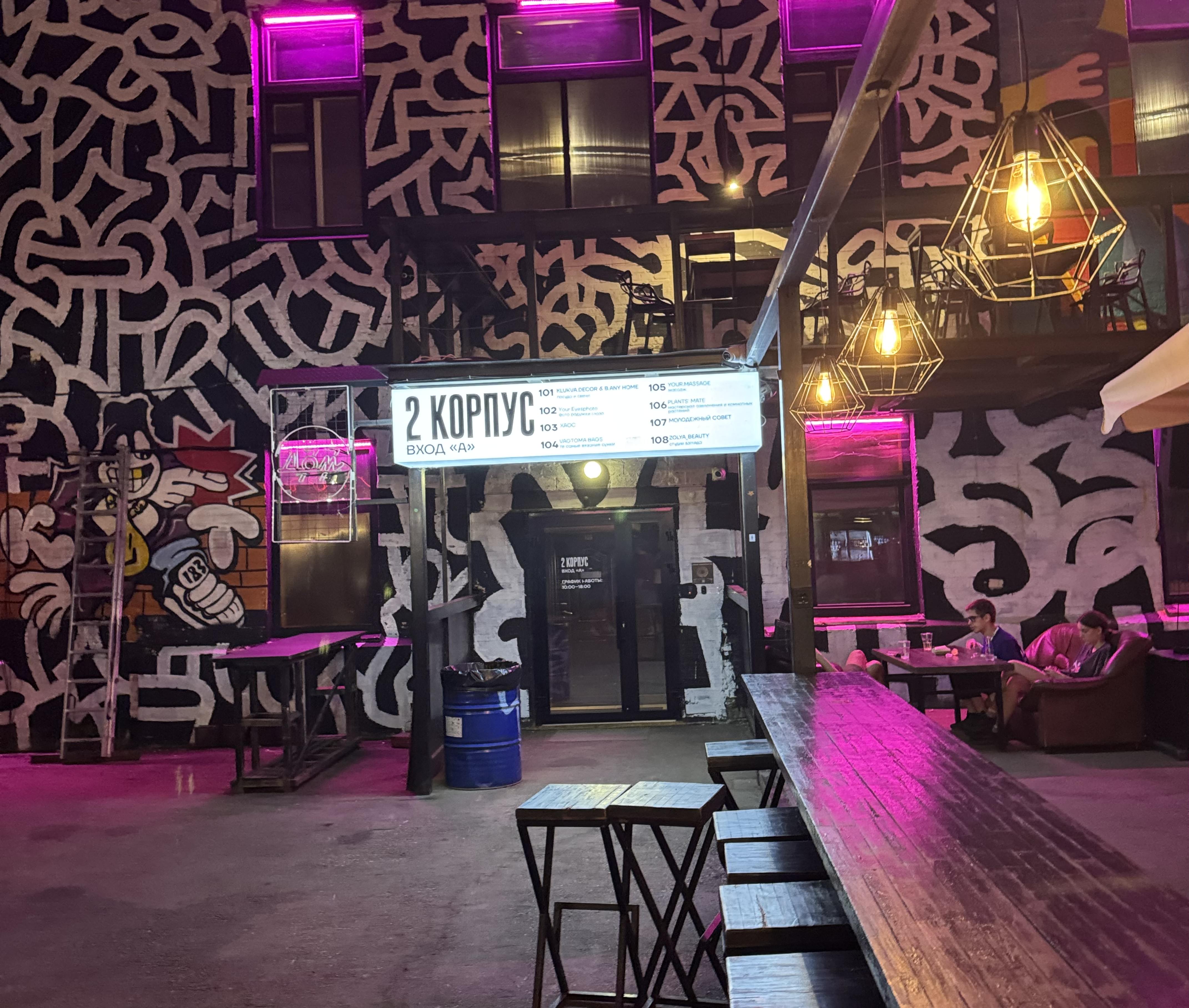 Главная точка притяжения молодой Самары — квартал вокруг Ленинградской, 77. Это не один бар, а «экосистема двора»: здесь же «Вечно молодой», «летник», всякие тату с студии, поп-апы и магазины, место, куда приходят «на час», а остаются до закрытия.