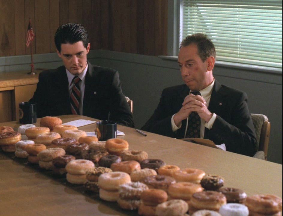 Линч умело использовал символизм и скрытые смыслы во всех своих картинах. Донаты из офиса шерифа – это не просто утренний ритуал и неотъемлемая часть сериал, но и своеобразный остров стабильности в мире угрюмого хаоса. Ведь Гарри Труман (шериф) ни за что и ни при каких обстоятельствах не отказывался от американских пончиков со сладкой глазурью. Но и от реалистичного бытия режиссер также не уходил: в 50-е годы было не так много вариантов перекуса для тех, кто работает по ночам, именно в этот период массово начинают открываться круглосуточные пончиковые с дешевым продуктом. Спасение для любого голодного полицейского – не иначе.