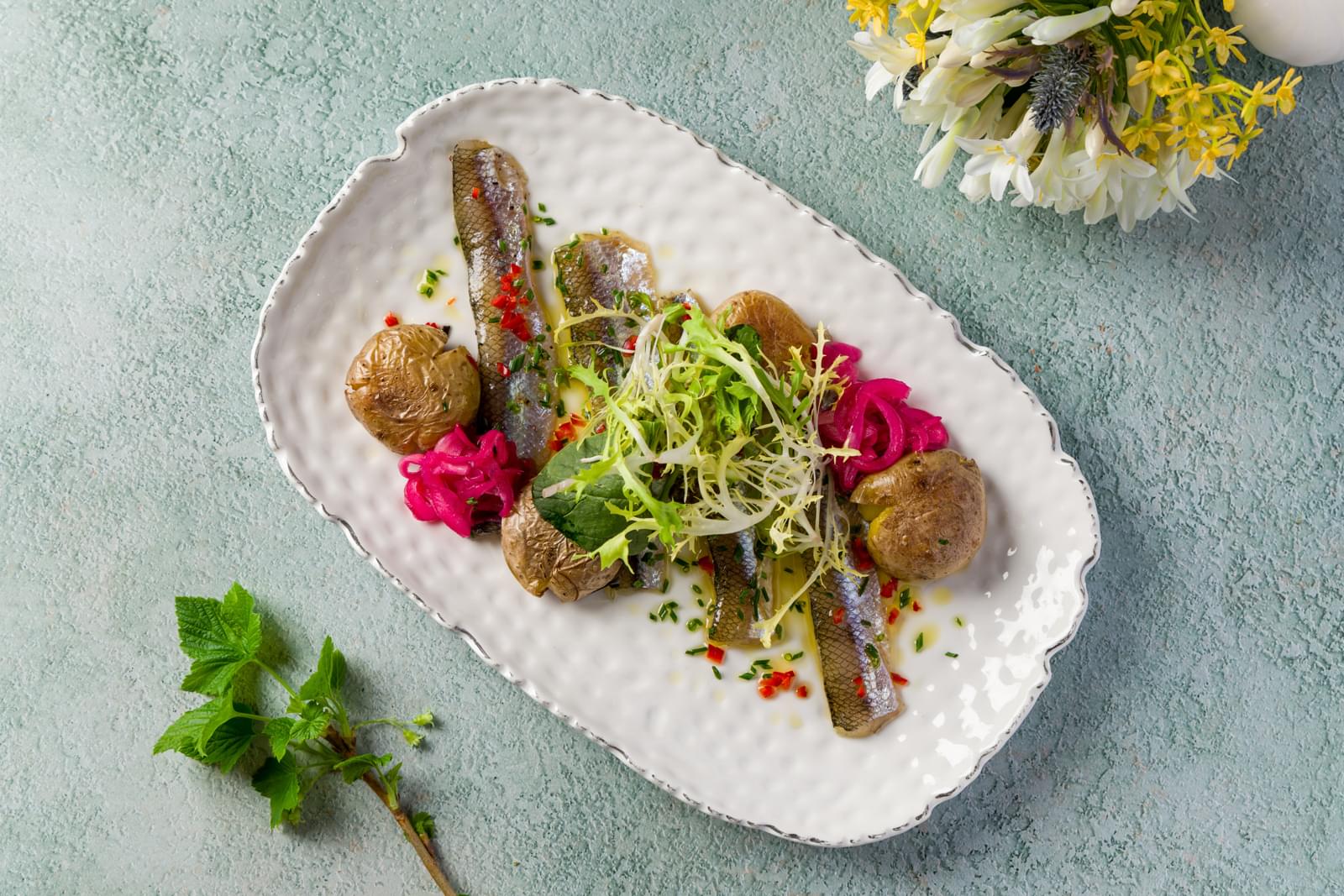 Корюшку можно не только жарить: Владимир Сидоров, шеф ресторана «Черетто Море» делает рыбку домашнего посола и подает с молодым картофелем и красным маринованным луком. Посол очень деликатный, чтобы не заглушать основной вкус корюшки.