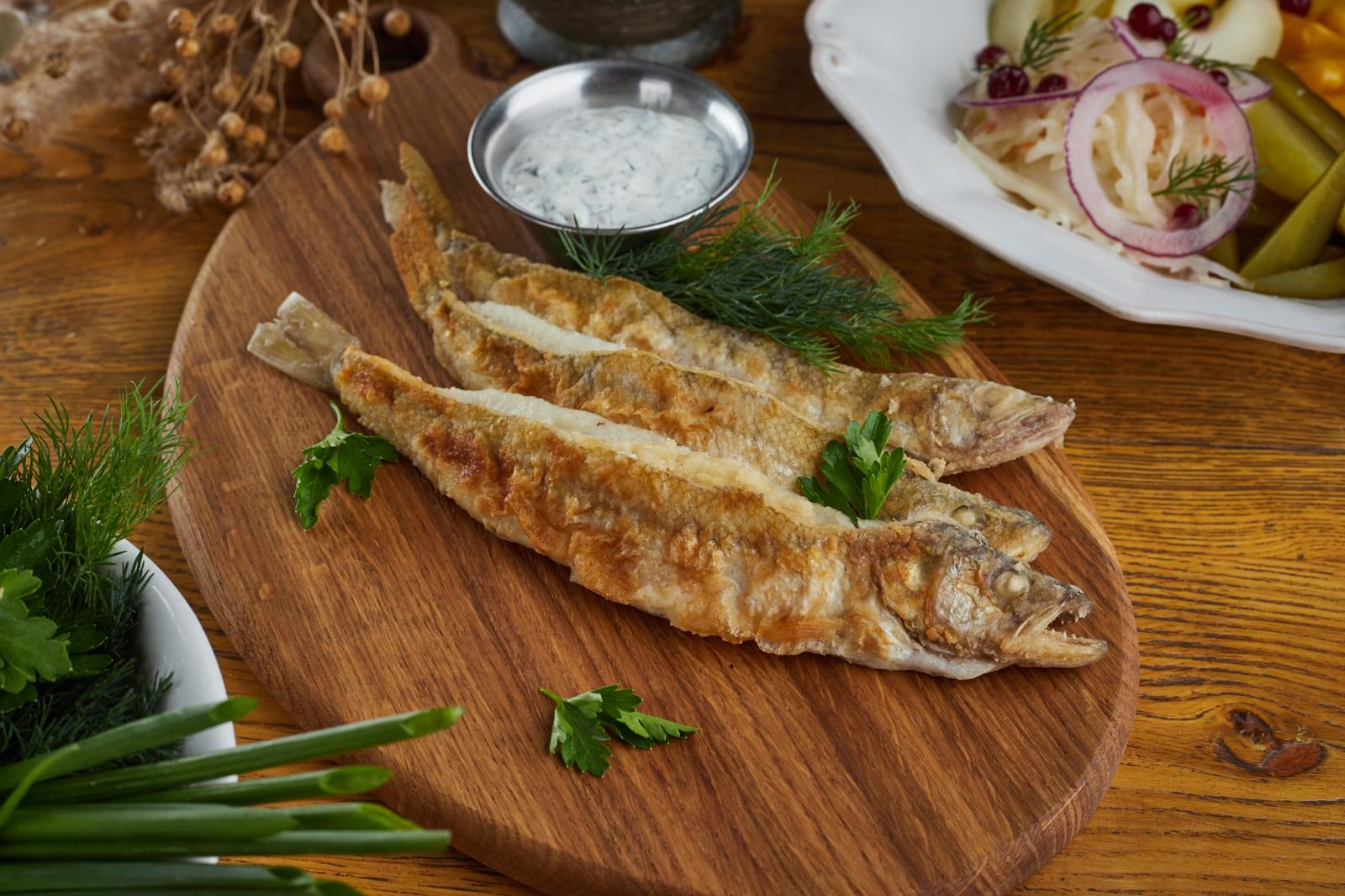 Но если душа требует жареной корюшки, то здесь ладожскую корюшку жарят в сливочном масле и подают с картофельным пюре, соусом тартар и малосольными огурцами.