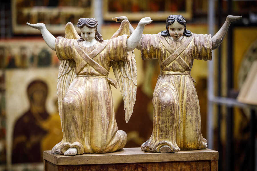 Исполненные в начале XIX века ангелы — особенный пример русской деревянной храмовой скульптуры. Подобные образы украшали резные иконостасы, составляя своеобразные театрализованные представления на темы Священного Писания. Однако, немногие из них пережили ход истории. В XVIII–XIX веках скульптурные изображения удаляли из храмов или уничтожали из-за неправильно трактованного указа Святейшего Синода, а в советское время они гибли вместе с убранством закрывающихся церквей. Чудесным образом пережив все исторические катаклизмы, парные скульптуры, исполненные для одного ансамбля, воссоединились – в октябре второй ангел тоже станет частью коллекции Третьяковской галереи. После этого начнется реставрация обеих скульптур, а увидеть ангелов в музее можно будет уже в 2025 году.