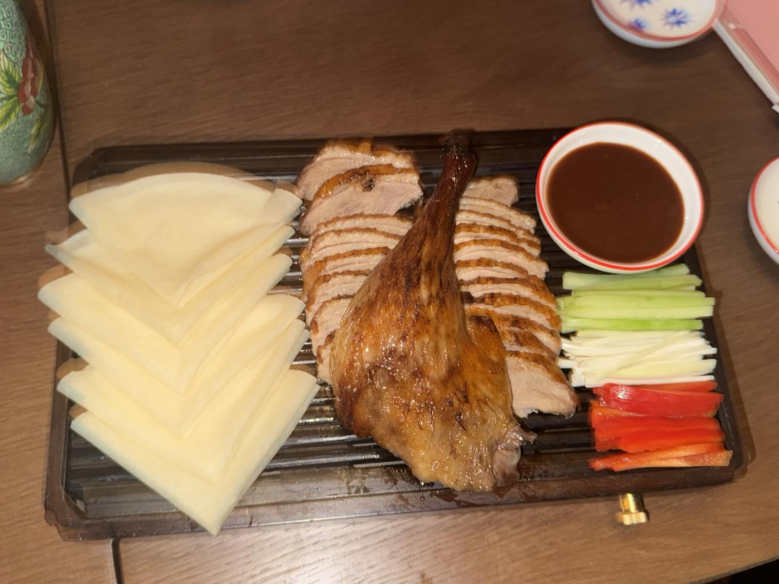 Ритуал «собери сам» обязателен: блинчик → тонкий слой хойсина → пара ломтиков утки → огурец и перо зелёного лука → сворачиваем. Растерялись — официант соберёт первый «образцовый».