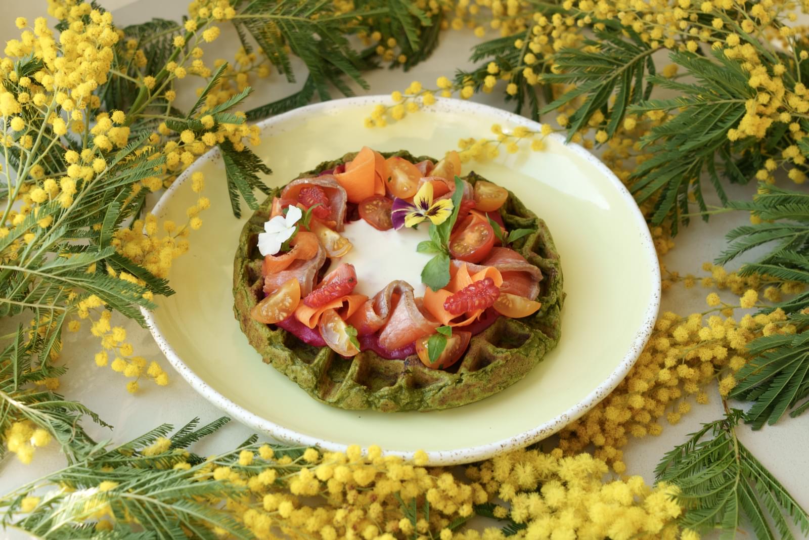 Каждый месяц в ЖÖН появляется «вафля месяца» — сезонный special, отражающий сезонные краски. В марте это «Весенний букет» — шпинатная вафля с опалённым лососем, спелой малиной и кремом сулугуни.