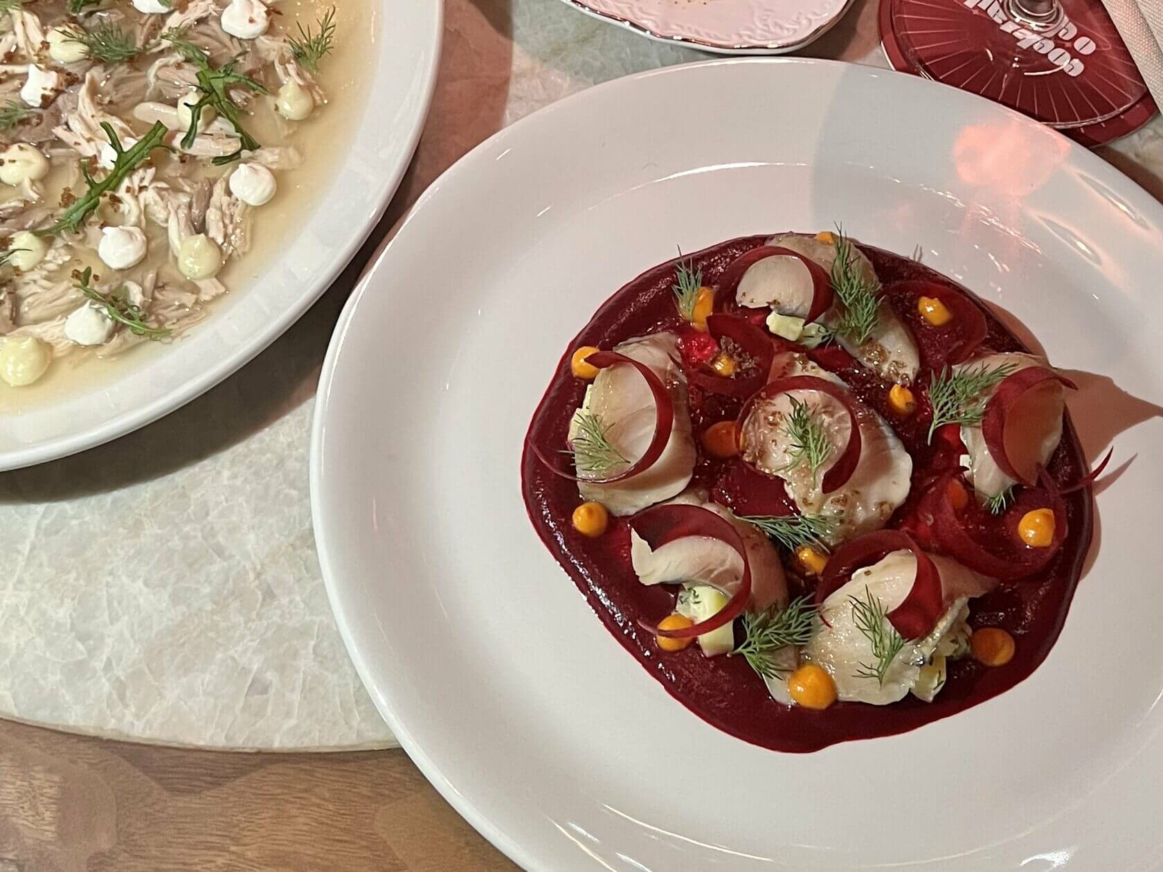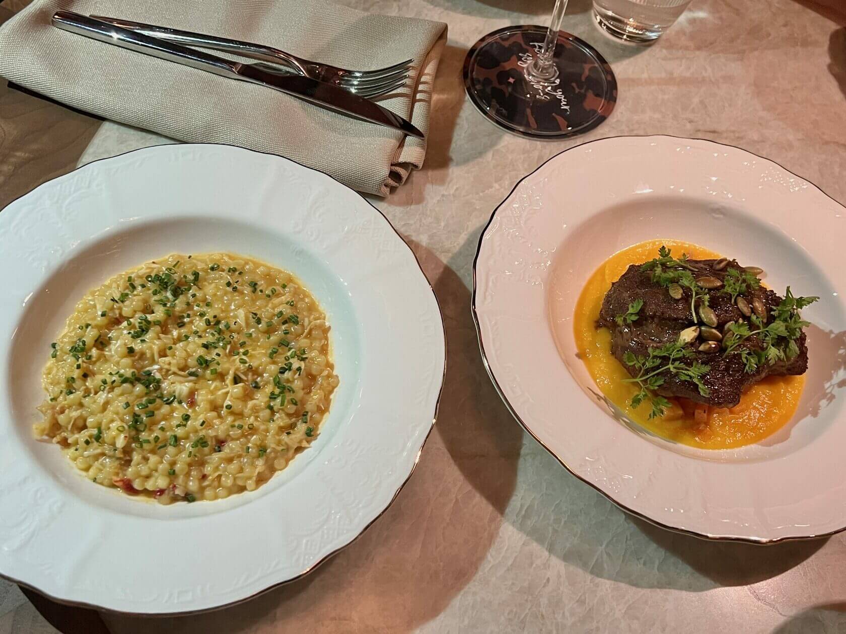 слева - фрегола с крабом, справа - телячьи щечки с тыквенным пюре