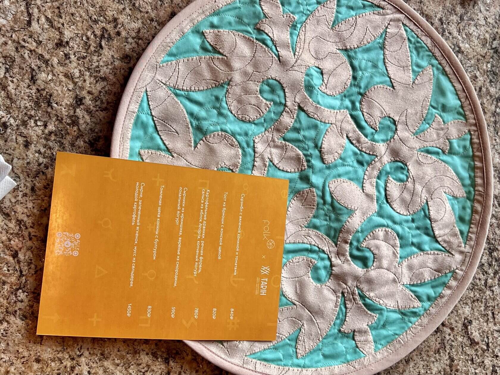 Ресторан Tarih существует в ”старом” Алматы уже три года и переводится как «история». Нэйминг легко и радостно поясняют: «это наш принцип — давать самое лучшее гостю, встречать его с большим почетом, уважением и сопровождать подачу блюд какой-нибудь легендой». А чтобы погрузить москвичей в атмосферу уюта, с собой привезли не только конину, но и лоскутную технику “курак” — ручная вышивка на салфетках, символ центра общения и круглого стола, за которым когда-то собирались в юртах.
