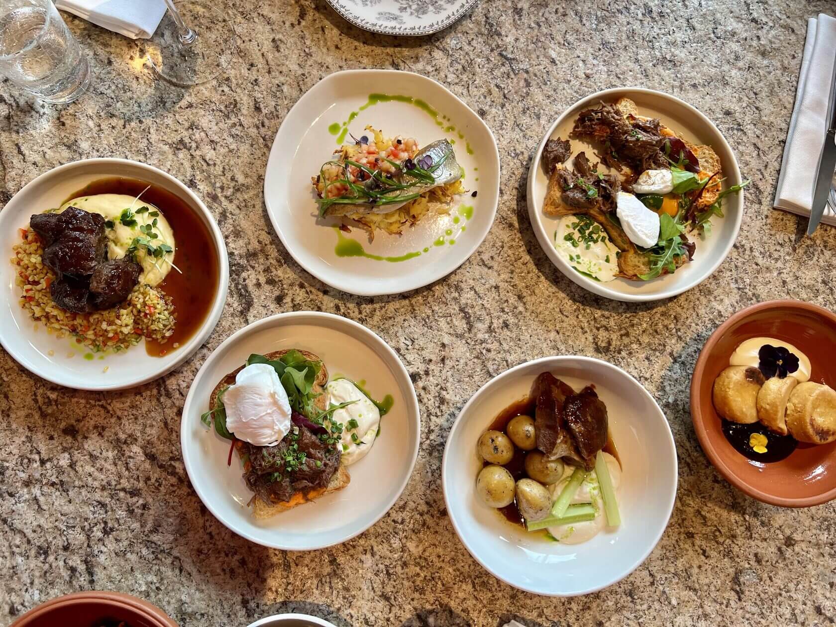 Кухня степного народа не может существовать без конины. На бранче ищите её в скрэмбле с томатами (840р), на тосте из бриоши (820р) и томленой, в компании с булгуром (830р). За последним, буквально тающим во рту, мясом стоит две недели безостановочной работы: «Мы начали готовиться к бранчу с 1 февраля. В подготовку входит разделать мясо, замариновать, держать его в рассоле, для того, чтобы соль впиталась в мясо. Затем запечь его 4,5 часа, чтобы оно впитало аромат трав и красного вина. После, надо около 12 часов, чтобы оно остыло. Это для того, чтобы мы могли его резать, ведь в горячем виде оно не режется, оно просто рвется. Затем мы это вакуумируем по порциям и кладем в шоковую заморозку. Везем сюда, размораживаем и готовим. В целом, такая вот длинная история».