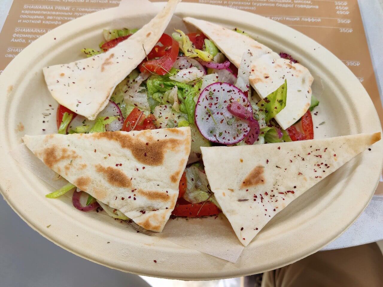 Салат фаттуш c фермерскими овощами, заатаром и хрустящей лаффой (390 ₽)