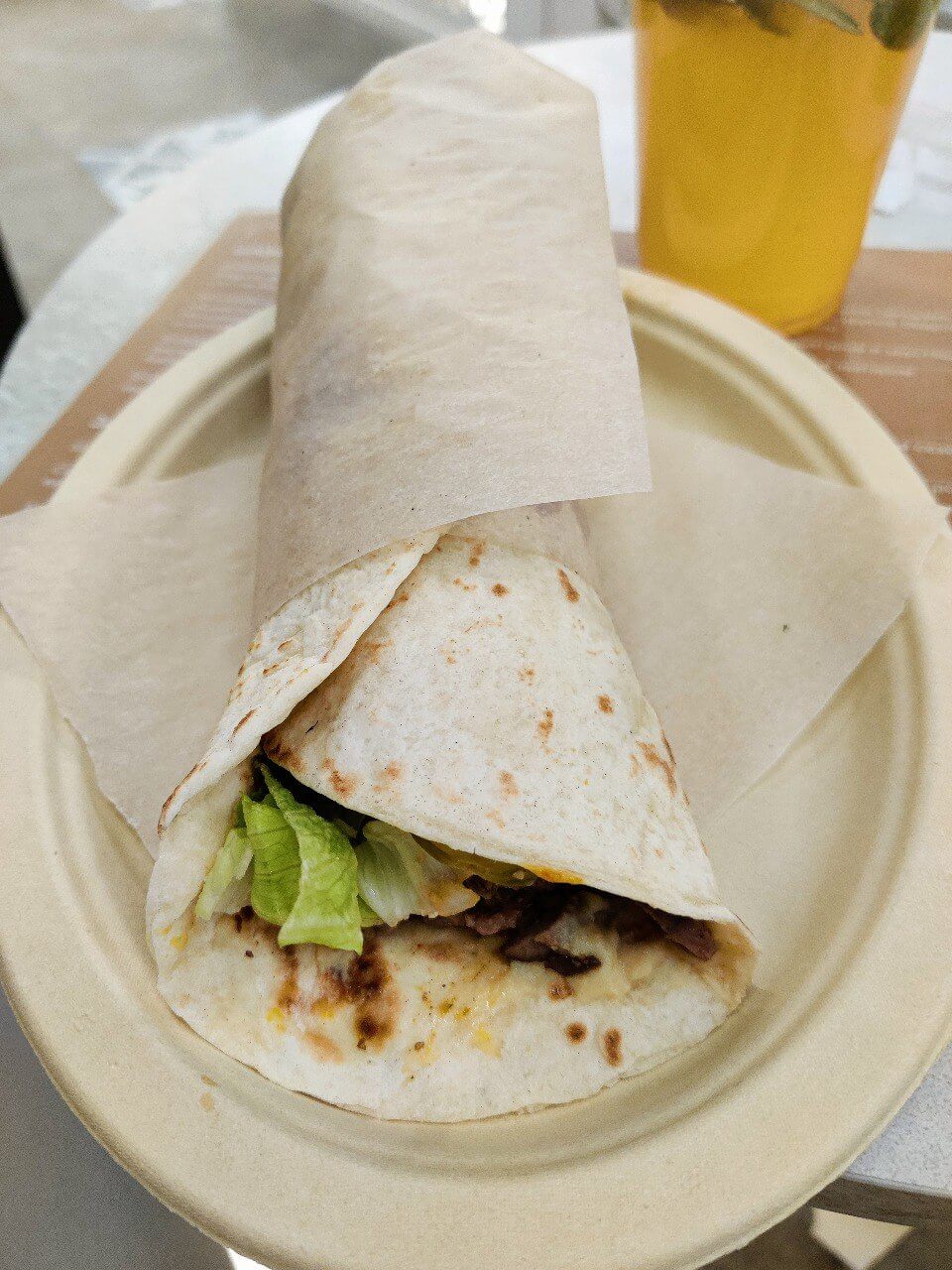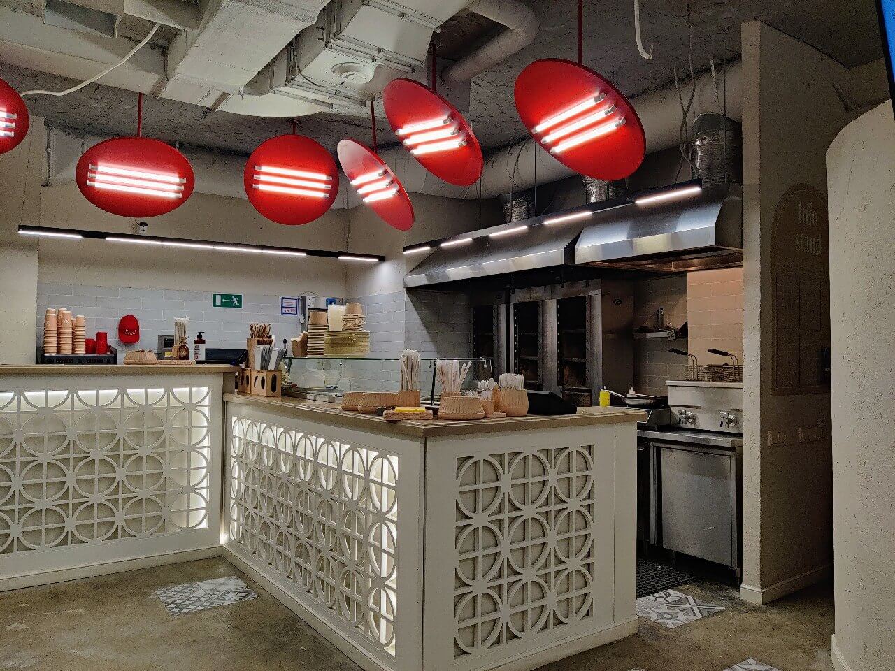 В помещении все намекает на формат «на вынос» (разовая посуда, неудобные столы и стулья). За все время моего пребывания сотрудников было больше чем гостей, что уже говорит о «популярности» места. Зачем такому миниатюрному заведению быстрого питания 5(!) работников, для меня большая загадка!
