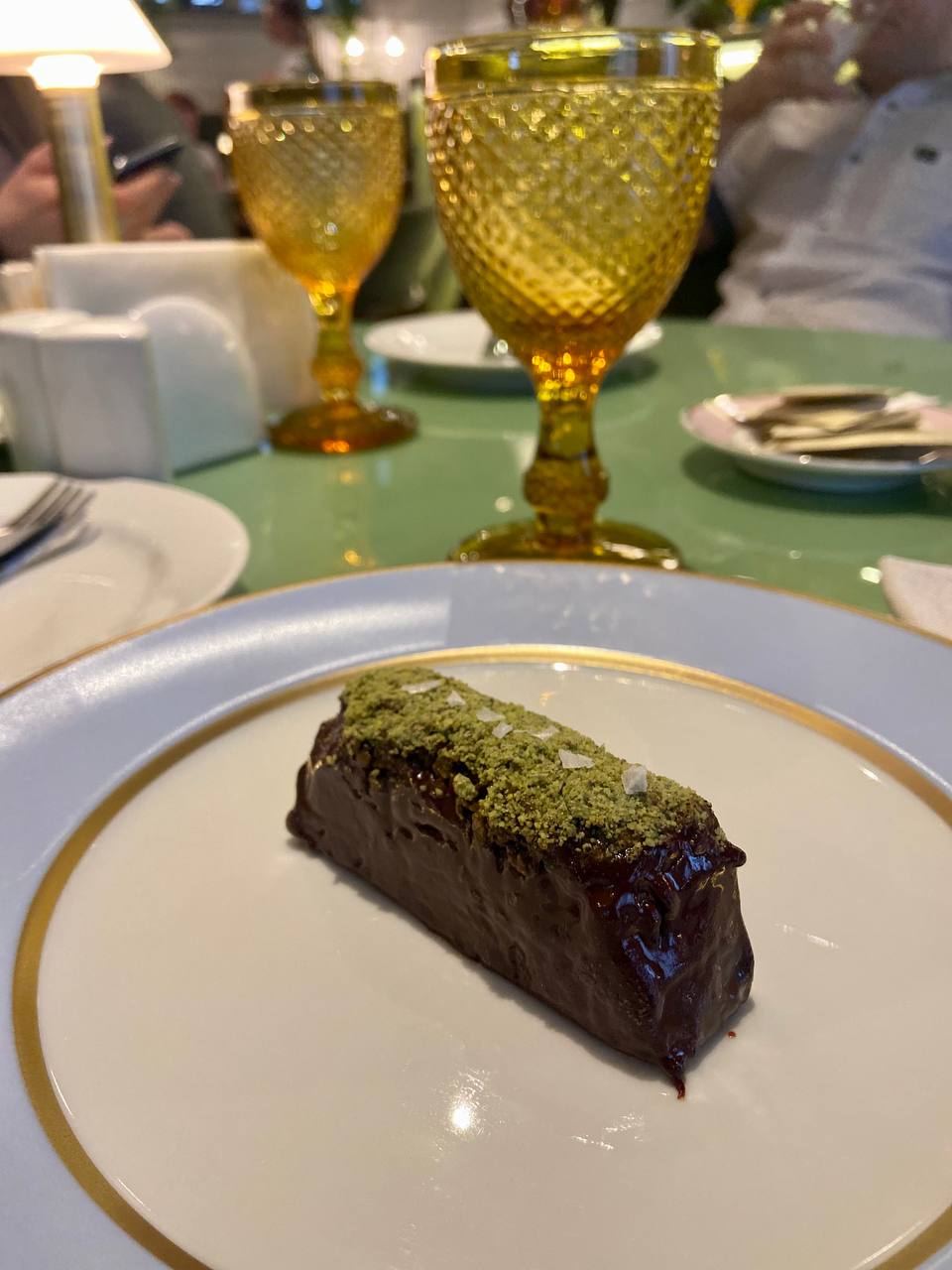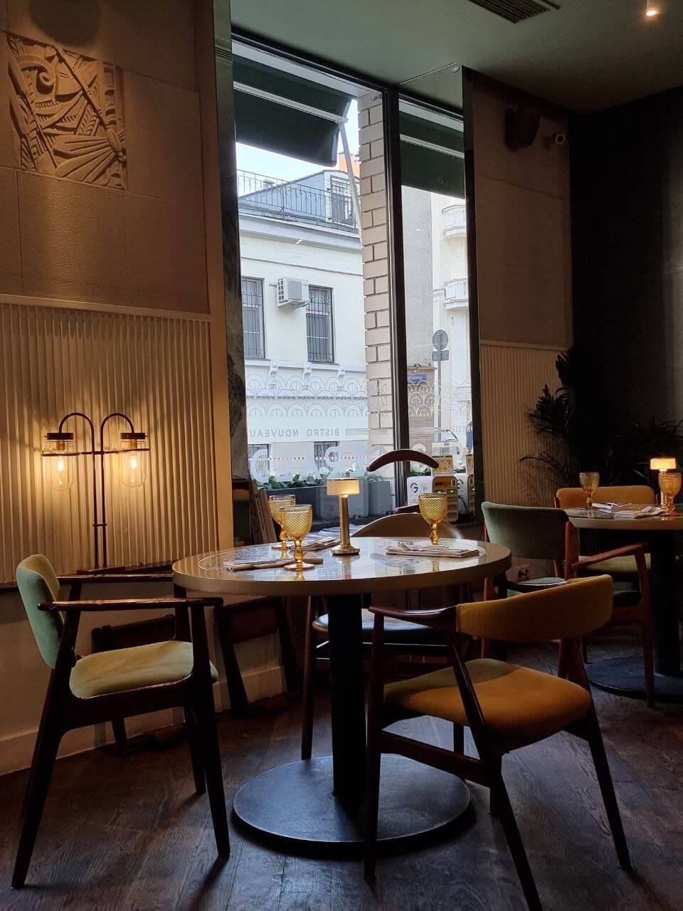 Финальным аккордом дегустации ожидаемо выступили десерты. Новинка — темный шоколад с пралине из фисташки (480₽) имеет яркий, но при этом не приторный вкус. Шарм этой позиции придает хрустящее пралине. Десерт определенно придется по вкусу большим любителям шоколада. Из постоянного меню выбор пал на крем-брюле маракуйя (450₽). По сравнению с новинкой, этот десерт гораздо более легкий. Свежести придает как маракуйя, так и используемая для украшения клубника. Но карамельной корочки оказалось чуть больше, чем хотелось бы. Отдельно хочется отметить, что находиться в уголке Франции на Остоженке, в целом, весьма приятно. Интерьер необистро выдержан во французской стилистике 50−60-х годов. Гостей окружают сдержанные цвета, мягкие кресла, композиции из живых цветов и завезенные прямиком из Парижа книги и журналы. Пространство небольшое, но в нем нашлось место барной зоне с контактной стойкой и прозрачным винным шкафом. К слову, винная карта, как и ожидается, полностью состоит из французских вин, в которых хорошо разбирается местный сомелье. Хоть и бокальных позиций немного, он с радостью подберет подходящее вино к выбранному блюду. К элементам «избыточного ретро» можно отнести огромное ламинированное меню. Несколько гостей запросто могут накрыть им весть стол. Но в ресторанах Раппорта этому удивляться, увы, уже не стоит. Также разочаровало отсутствие комплиментарной воды, которая давно стала нормой для многих столичных и парижских ресторанов.
