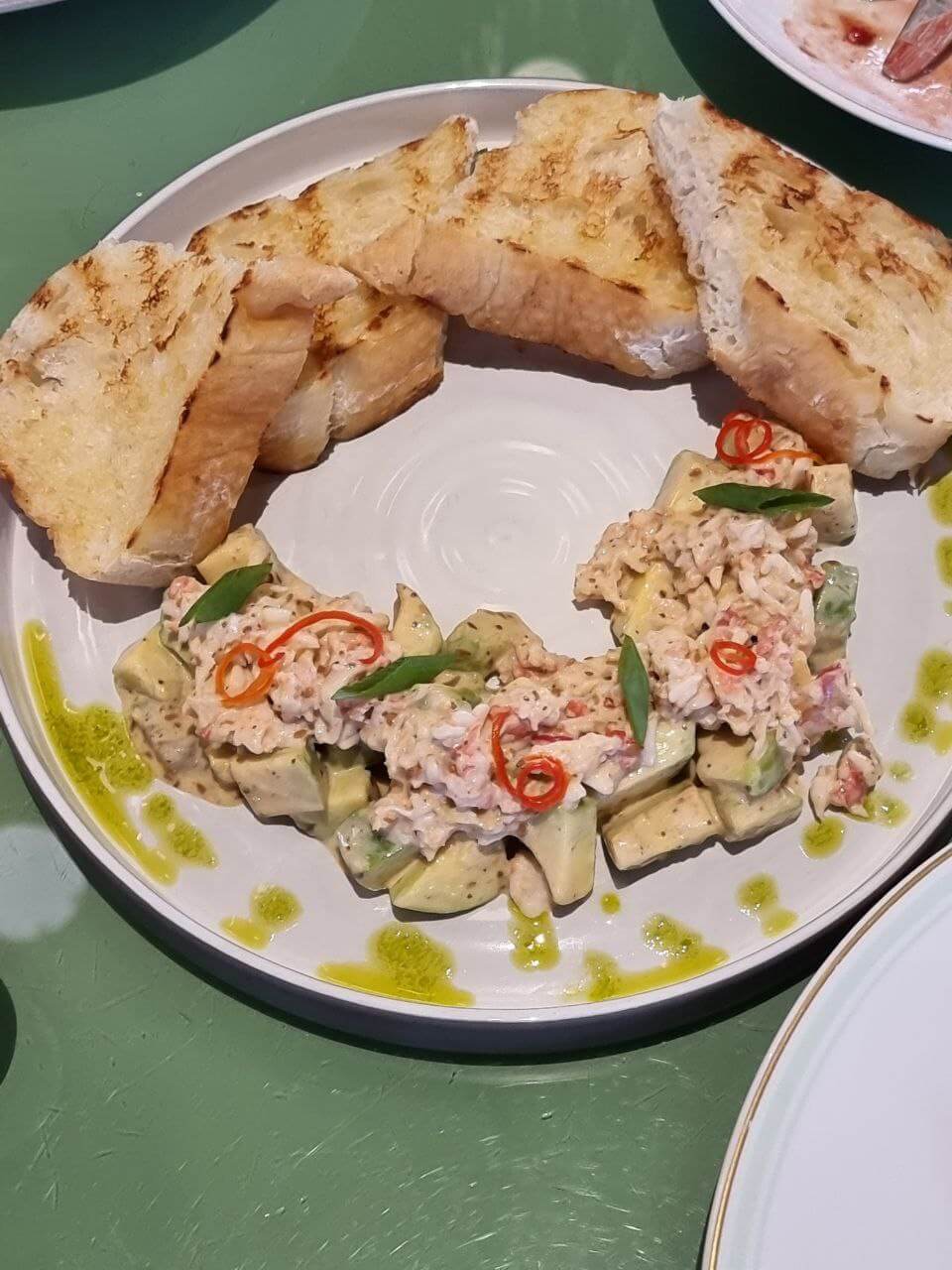 На этом фоне гораздо менее удачно выглядит фирменная брускетта с крабом и авокадо (1300₽). Ключевым компонентом блюда выступает обильно приправленный маслом хлеб, на фоне которого теряется посредственный авокадо и вкусный, но почти незаметный, краб.